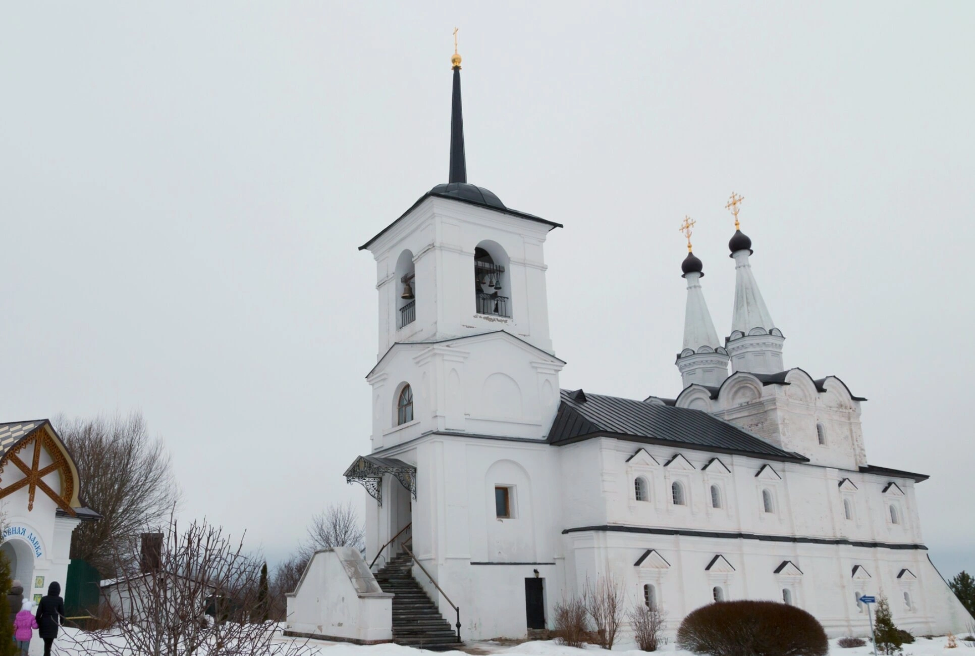 На снимке храм изображён в зимнем убранстве, что подчёркивает величие древней архитектуры на фоне заснеженного пейзажа. Белоснежные стены церкви гармонируют с снежным покровом, а золотые купола и кресты символизируют свет православной веры, сохраняемой в этом святом месте на протяжении столетий. Введенская церковь вместе с Преображенским собором середины XVI века представляет собой единственный в окрестностях Калуги ансамбль памятников допетровского зодчества.