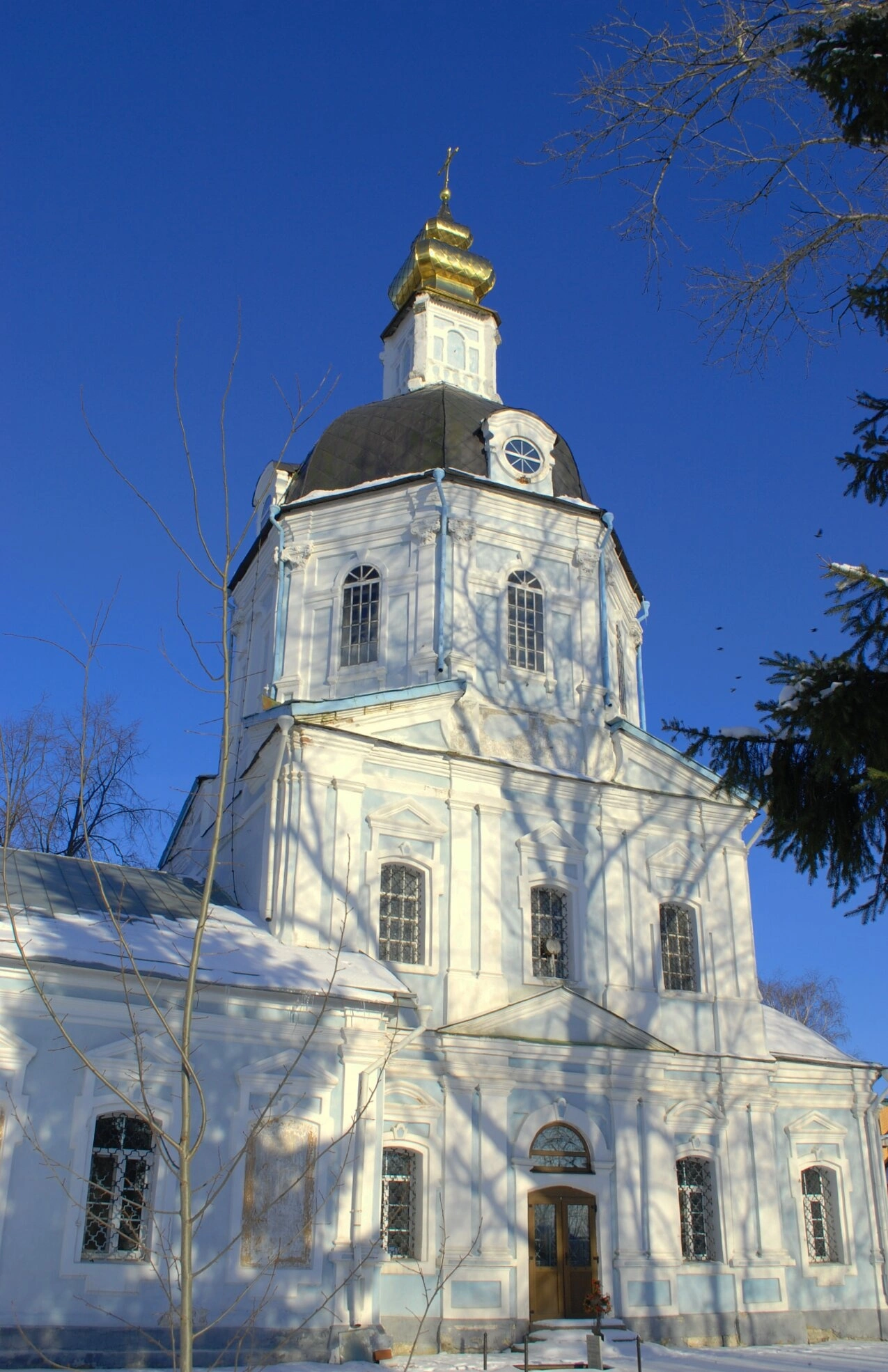 Белоснежные стены двухъярусного церковного здания гармонично сочетаются с чистым снежным покровом, покрывающим землю. Чёрные купола храма увенчаны сияющими золотистыми крестами, символизирующими победу Христа над смертью. На фасаде чётко просматриваются высокие арочные окна, характерные для церковной архитектуры.