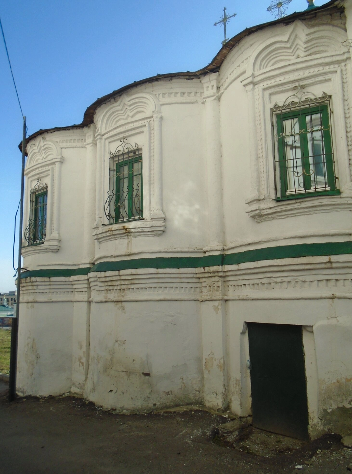 Фасад украшен тремя оконными проемами с изящными наличниками сложной формы, характерными для барочной стилистики. Ярко-зеленые рамы и защитные решетки на окнах добавляют фасаду выразительности и завершенности. Изогнутые линии крыши и фронтонов над окнами создают живописный силуэт, устремляющий взор вверх, к установленному на кровле православному кресту — главному символу христианского спасения. Небольшая входная дверь в правой части кадра свидетельствует о традиционном для храмового строительства расположении входов.