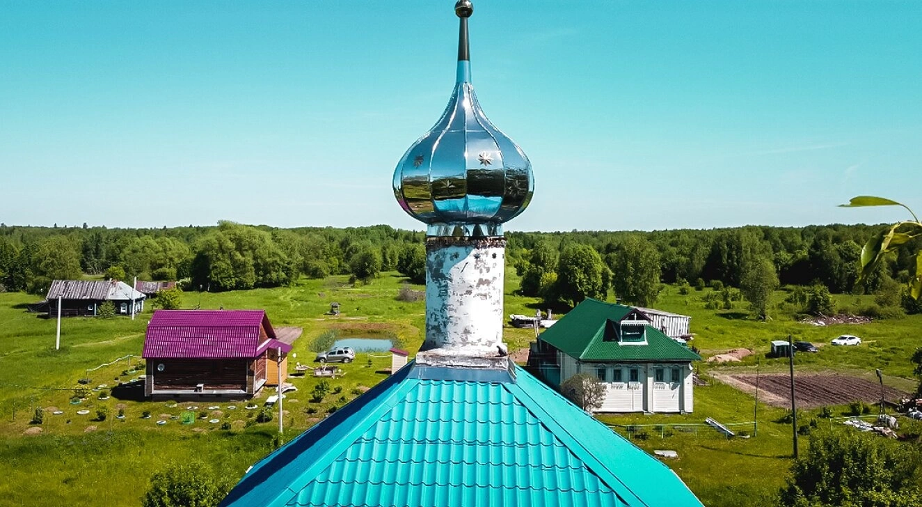 Храм расположен в живописной сельской местности, окружён традиционными деревянными домами и богатой растительностью. Неподалёку от церкви находится небольшое озеро, что добавляет особую гармонию в окружающий пейзаж. Снимок сделан в ясный солнечный день, когда лазурное небо подчёркивает благолепие православной святыни.