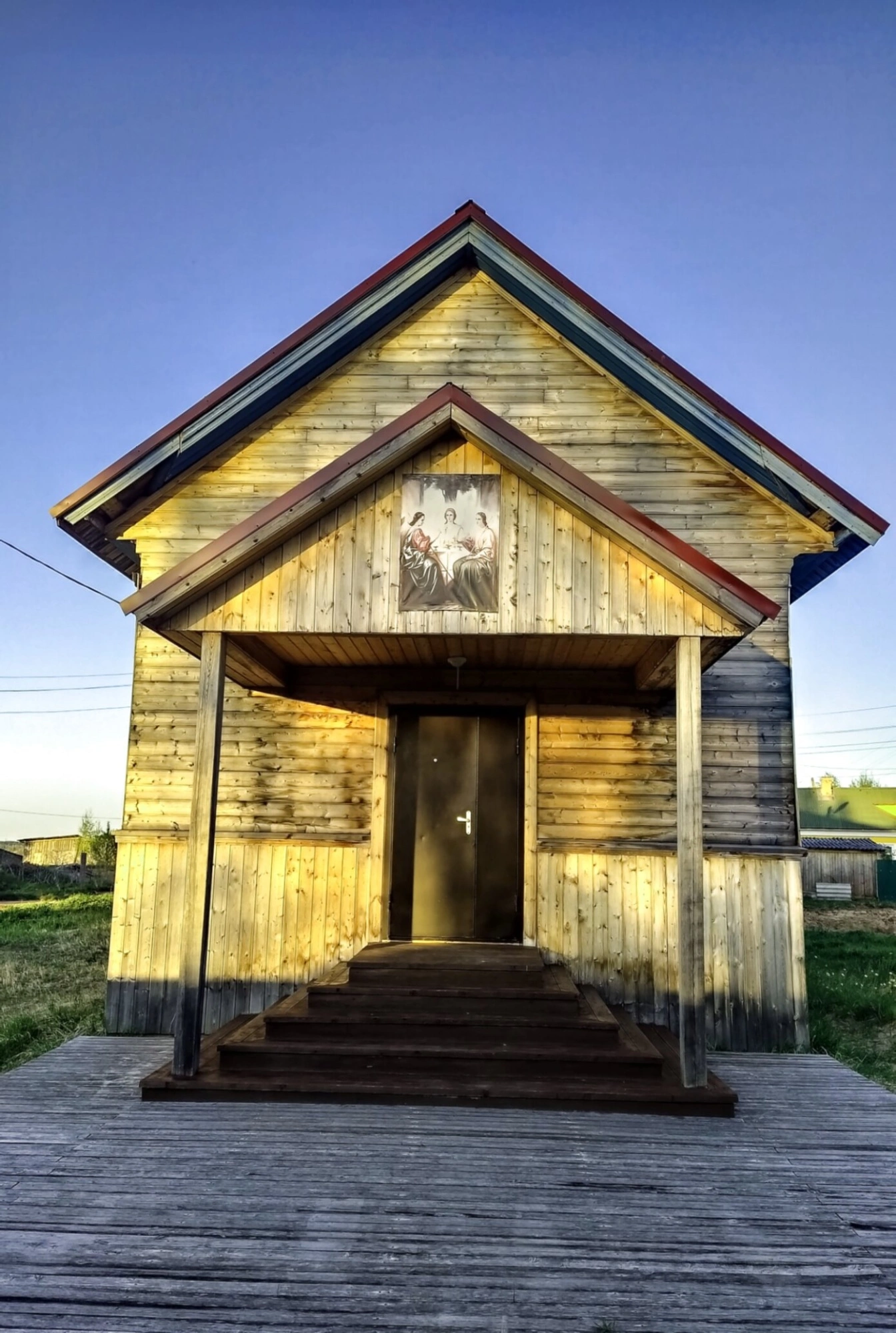Особую атмосферу снимку придают лучи заходящего солнца, которые мягко освещают древние стены, создавая тёплые оранжевые оттенки на поверхности дерева. Такое освещение подчёркивает благородную патину времени на стенах храма. На заднем плане виднеется зелёная трава и ясное голубое небо, что добавляет кадру природной гармонии.
