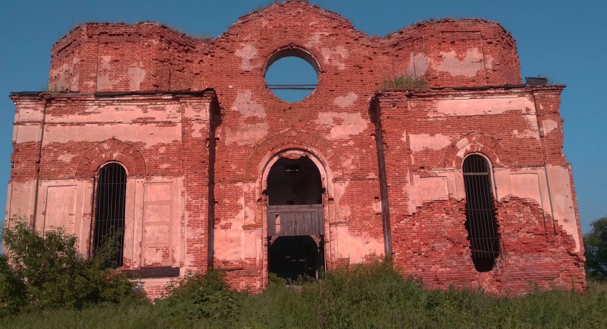 На представленной фотографии запечатлена разрушенная Церковь Введения Пресвятой Богородицы во Храм, расположенная в селе Чемодановка Пензенской области. Этот некогда величественный православный храм, ныне пребывающий в руинированном состоянии, является молчаливым свидетелем истории и духовной жизни русского села.