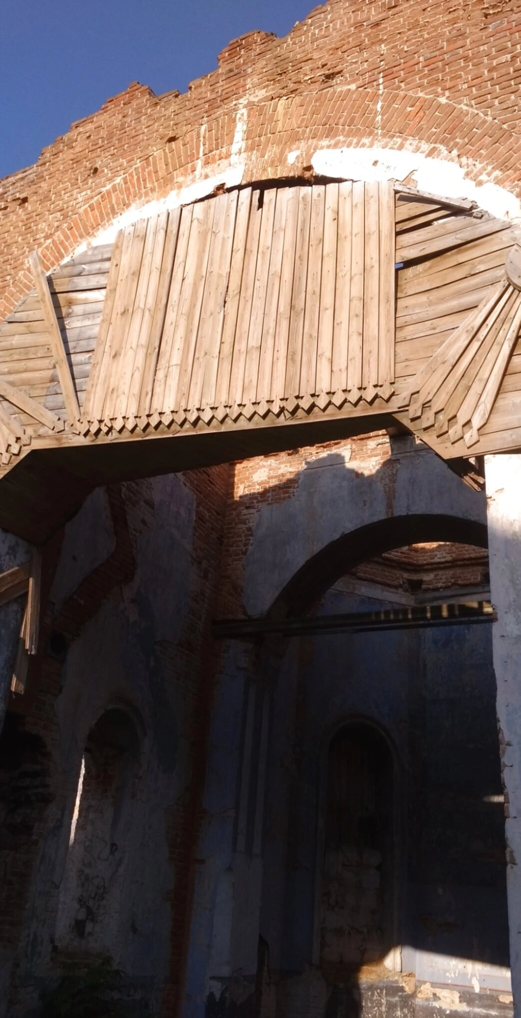 На снимке явственно читаются фрагменты кирпичных стен и арочных проёмов, которые даже в своём разрушенном состоянии свидетельствуют о масштабах и благолепии бывшего храма. В верхней части одного из проёмов угадываются остатки деревянной конструкции, возможно, элементы позднейшей зашивки или следы попыток по сохранению, что лишь подчёркивает трагичность произошедшего. Озарённые лучами солнца остатки кладки и обвалившаяся штукатурка создают резкий контраст света и тени, символизируя многовековое противостояние веры и забвения.