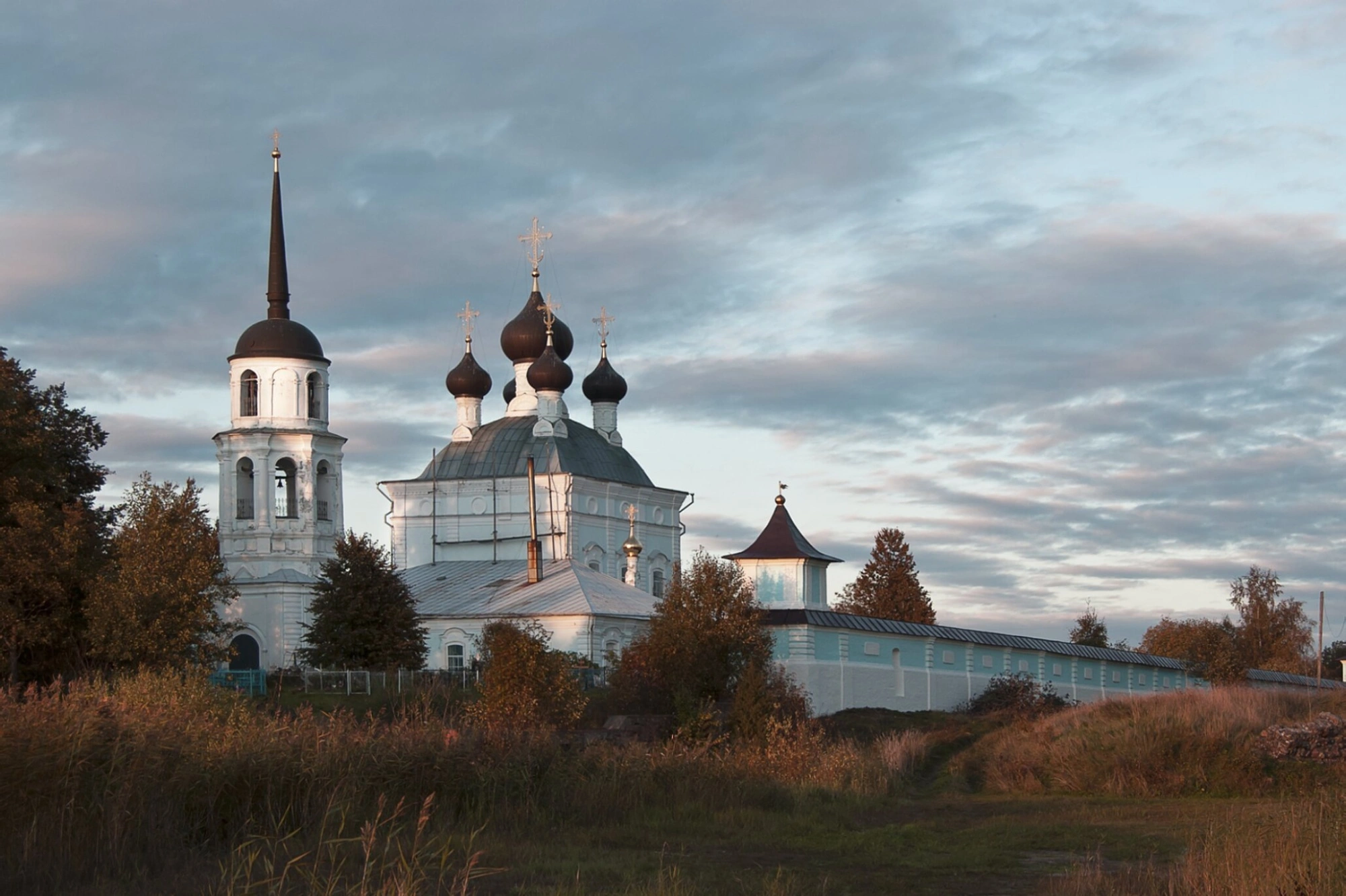 Снимок выполнен в условиях естественного освещения, вероятно, в часы восхода или заката. Мягкий солнечный свет озаряет белые стены, создавая игру светотени и подчёркивая благородную строгость архитектурных линий. Пасмурное небо с облаками придаёт изображению особую глубину и драматизм, оттеняя чистоту и величие святыни. Окружающая храм зелёная растительность — деревья и кустарники — свидетельствует о том, что фотография сделана в тёплое время года. Общий вид излучает благодатную тишину, умиротворение и молитвенную сосредоточенность, характерные для намоленных мест русской провинции.