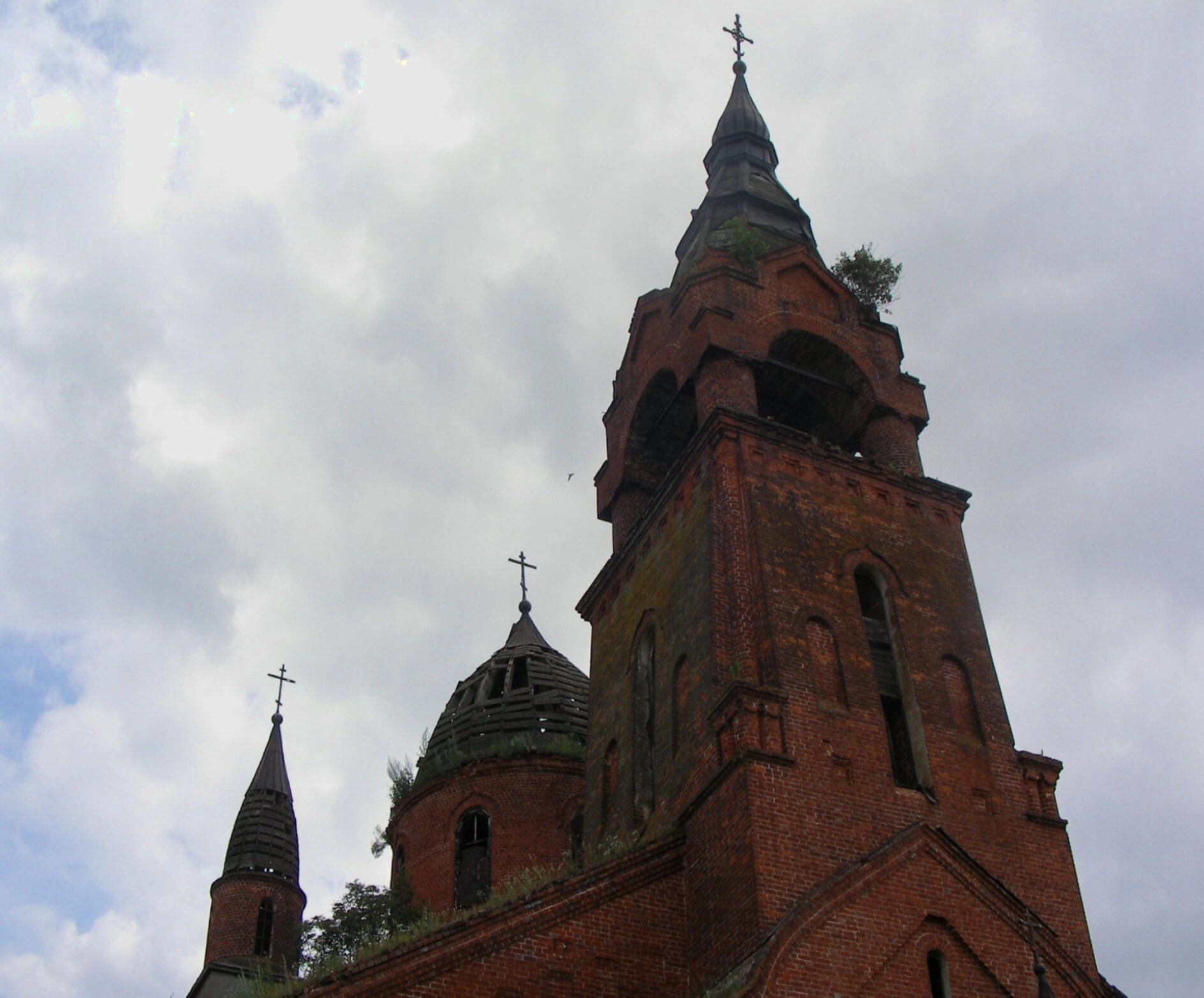 К сожалению, в настоящее время святыня пребывает в запустении. На фотографии видны следы разрушения: утраты кладки, повреждения купола и шпиля колокольни. Сквозь кирпичную кладку прорастает растительность, что свидетельствует о многолетнем отсутствии реставрационных работ и консервации объекта.