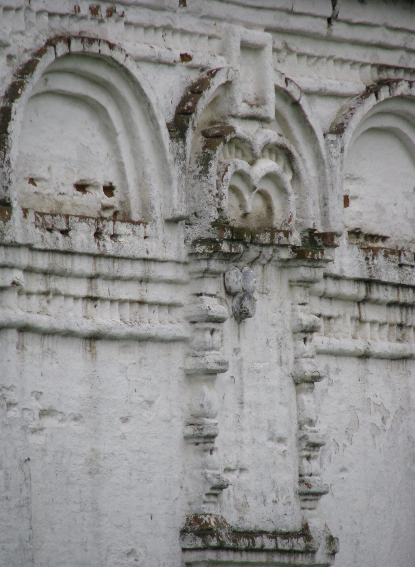 На снимке хорошо просматриваются элементы архитектурного декора, выполненные из кирпича и покрытые белой штукатуркой. Чётко видны арочные ниши, традиционные для православного зодчества, а также пилястры, украшенные изящными рельефными деталями и священными узорами. Эти архитектурные элементы не только выполняют декоративную функцию, но и несут глубокую духовную символику, характерную для церковного строительства.
