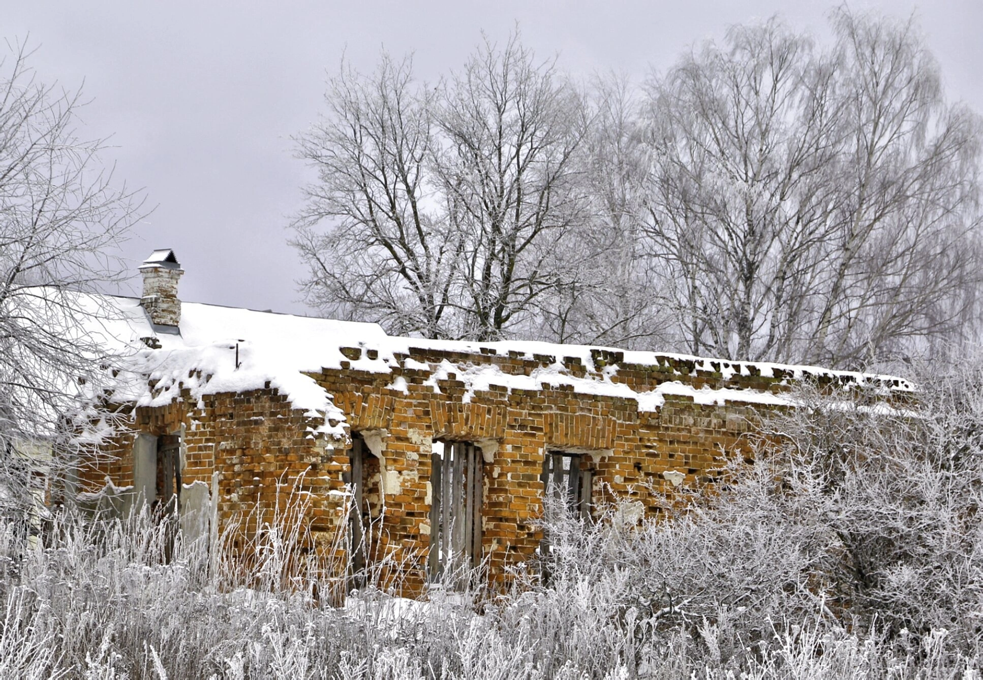 Зимний пейзаж усиливает ощущение утраты и забвения святыни. Крыша храма покрыта плотным слоем снега, сквозь который проступают контуры кирпичной трубы. Окружающие деревья и кустарники, укрытые инеем, создают атмосферу суровой русской зимы. Высокая заснеженная трава на переднем плане подчёркивает заброшенность места.