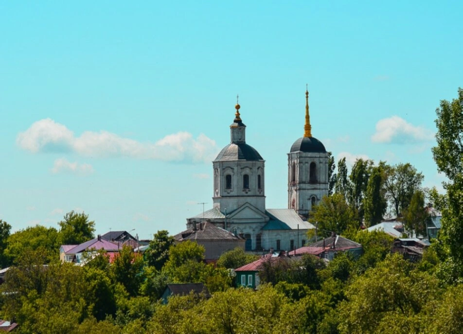 На фотографии запечатлён старинный Введенский храм, расположенный в историческом центре города Ельца Липецкой области. Этот православный храм, освящённый в честь Введения во храм Пресвятой Богородицы, является одним из выдающихся памятников церковной архитектуры и духовным центром города.