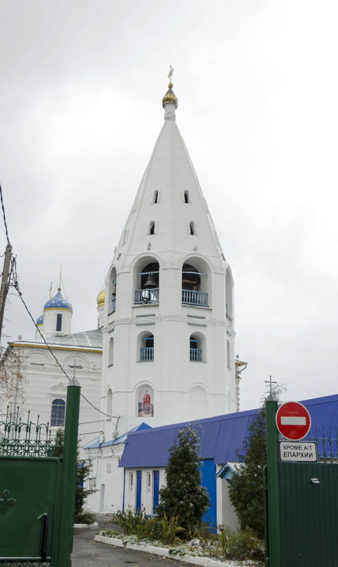 Архитектурный облик храма, который зритель видит на снимке, представляет собой прекрасный образец русского церковного зодчества. Белоснежные стены, устремлённая ввысь колокольня и сияющие на солнце золотые купола создают образ неземной красоты и благодати. Фотография позволяет рассмотреть строгие и в то же время величественные формы собора, который доминирует в окружающем его пространстве, приковывая взгляд своей духовной и исторической значимостью.
