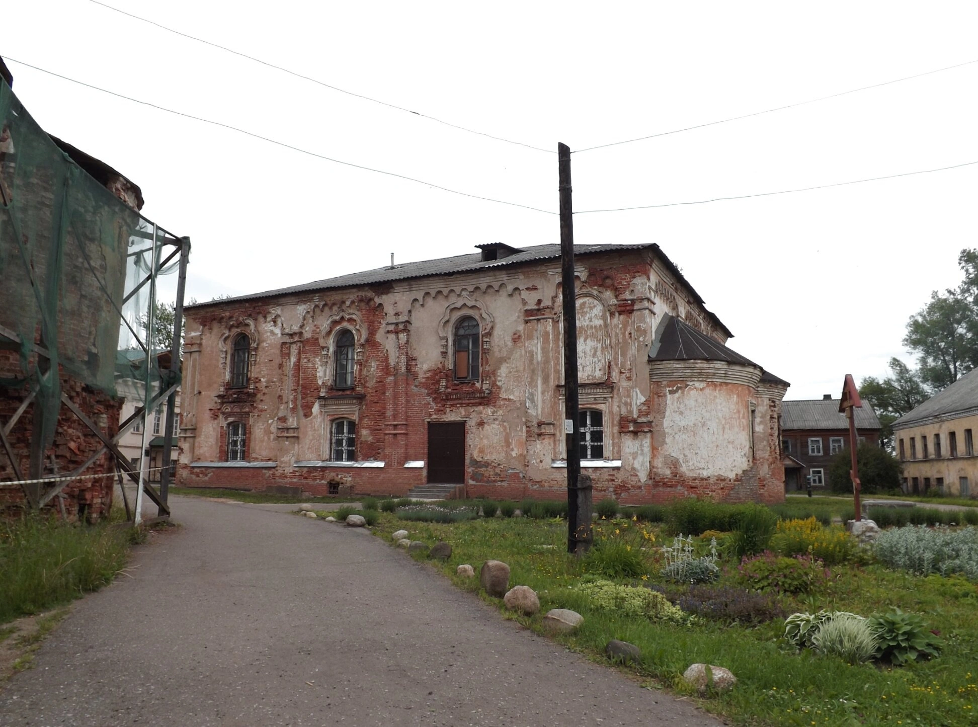 На представленной фотографии запечатлён Введенский женский монастырь в городе Тихвине, одна из значимых православных обителей Северо-Запада России. Центральным объектом съёмки является главный храм монастыря — собор в честь Введения во храм Пресвятой Богородицы. Здание выполнено из кирпича и обладает характерными для русской церковной архитектуры чертами: арочными оконными проёмами, полукруглой апсидой, обозначающей алтарную часть, и строгими фасадами. На момент создания фотографии храм пребывает в состоянии ветхости, на стенах видны следы разрушения штукатурного слоя, что свидетельствует о необходимости проведения срочных реставрационных работ.