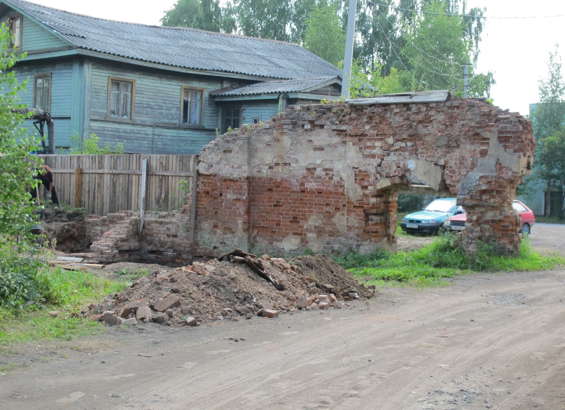 На представленной фотографии запечатлён исторический вид Введенского Тихвинского женского монастыря, расположенного в городе Тихвине Ленинградской области. На переднем плане видны благодатные труды по возрождению святой обители: проводятся земляные работы, что свидетельствует о начале этапа восстановления порушенной святыни.