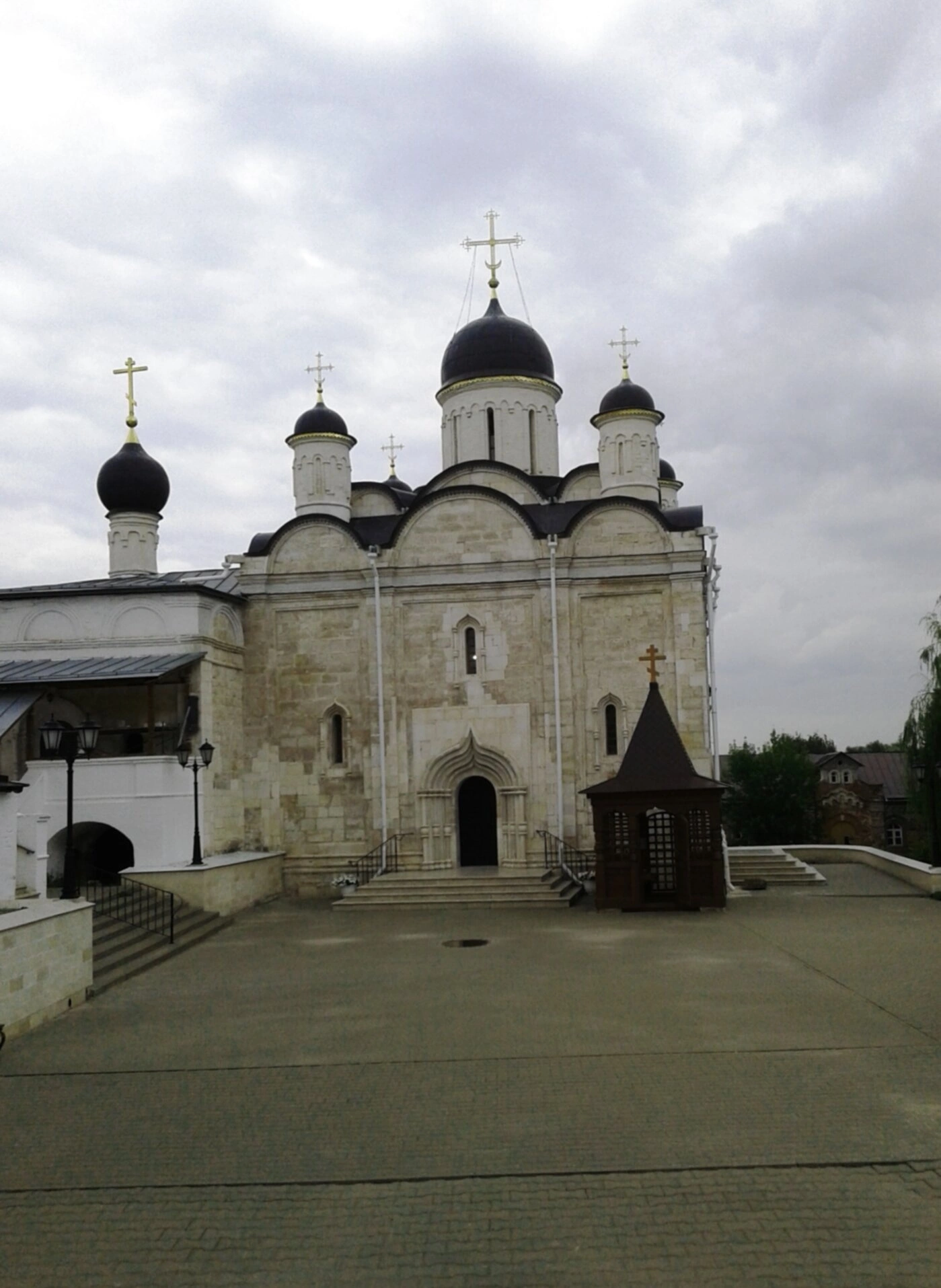На фотографии запечатлён Введенский Владычный женский монастырь, одна из древнейших православных обителей Подмосковья, расположенная в городе Серпухове. Центральным объектом снимка является величественный Введенский собор, главный храм монастырского комплекса. Собор увенчан тёмными куполами, которые завершаются златоглавыми крестами, сияющими даже в пасмурный день. Светлые стены храма создают благодатный образ чистоты и духовной радости.