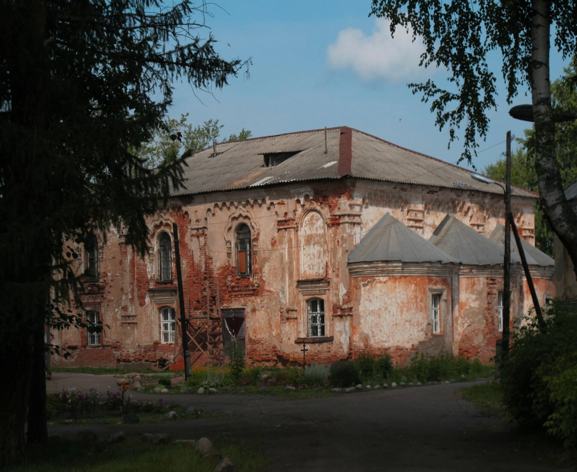 Здание монастыря, выполненное из красного кирпича, являет собою образец традиционного русского монастырского зодчества. На снимке видны характерные арочные оконные проёмы, строгие линии фасадов и следы благородного разрушения, говорящие о многовековой истории святого места. Частично повреждённая кровля и обветшавшие стены напоминают о непростых испытаниях, выпавших на долю обители в годы лихолетий.