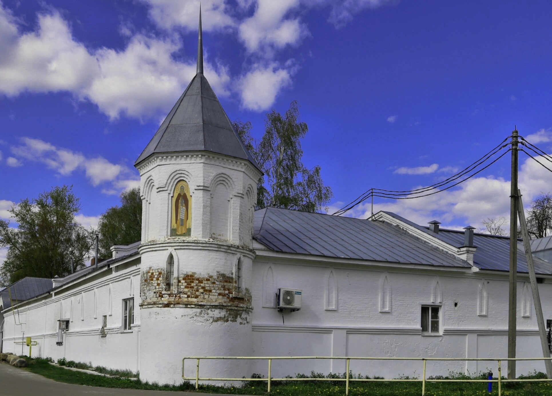 На представленной фотографии запечатлена мощная монастырская стена и юго-западная угловая башня Свято-Троицкого Стефано-Махрищского мужского монастыря, одной из древних православных обителей Владимирской земли. Каменные укрепления, окружающие монастырь, были возведены в XVII-XVIII веках для защиты святой обители от внешних угроз и символизируют духовную твердыню Православия.