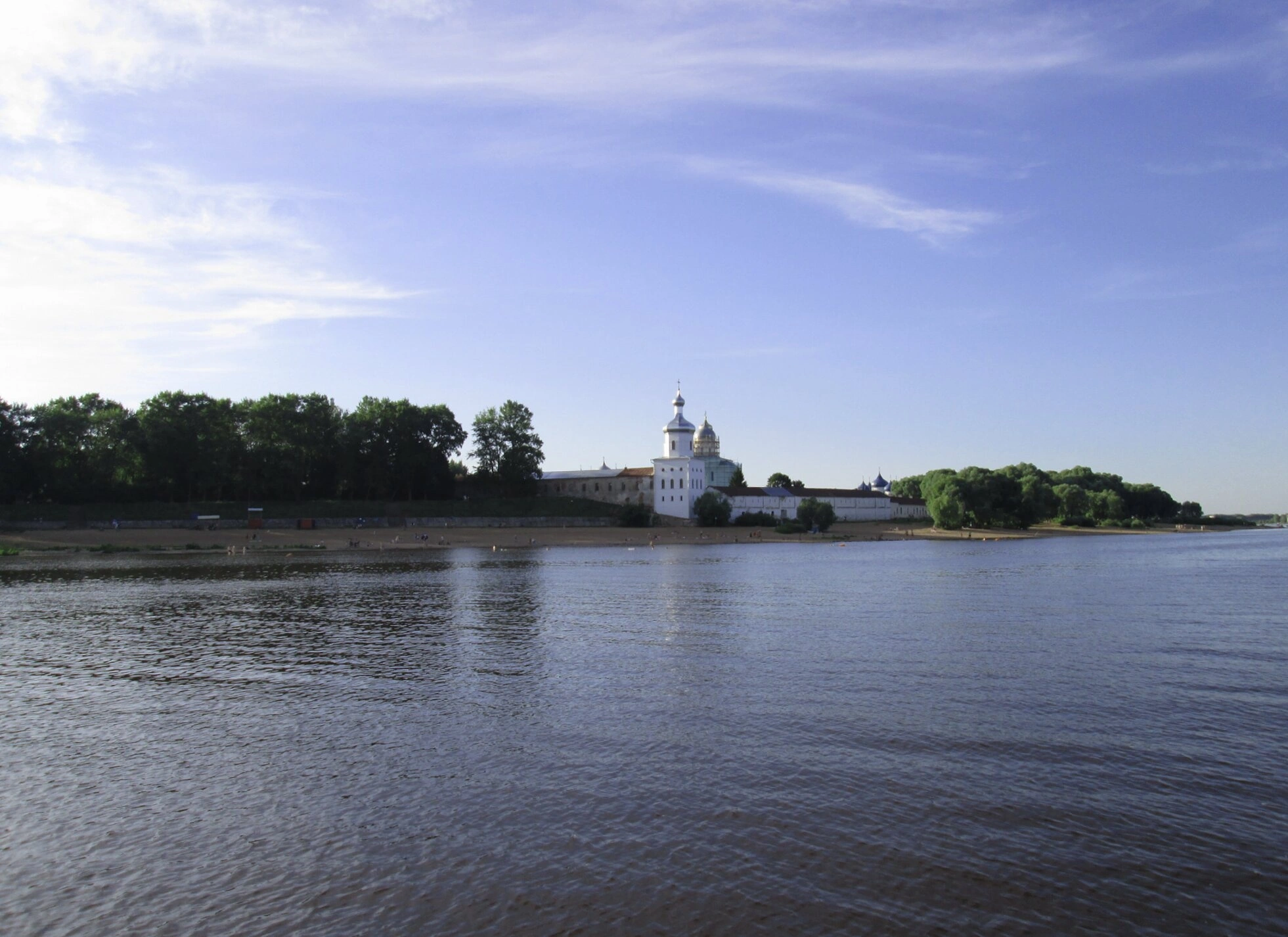 На переднем плане фотографии простираются воды реки Волхов, играющие важную роль в историческом и духовном ландшафте Новгородской земли. Река не только служила транспортной артерией, но и символизировала путь к духовному очищению для многих поколений паломников. Спокойное течение вод отражает небесную лазурь и величественные сооружения монастыря, создавая молитвенную атмосферу умиротворения.