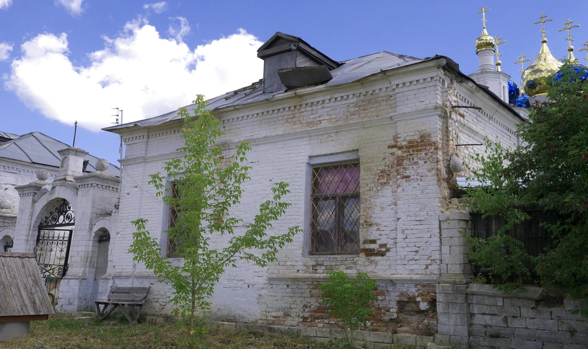 На представленной фотографии запечатлена южная сторожка, относящаяся к комплексу Храма Казанской иконы Божией Матери, что расположен в селе Киясово Серпуховского района Московской области. Небольшое одноэтажное здание сторожки, выполненное из кирпича и оштукатуренное, демонстрирует следы благородного возраста — облупившуюся побелку, сквозь которую проступает фактура кладки. Эта хозяйственная постройка, несущая в себе скромность и простоту, является неотъемлемой частью исторического церковного ансамбля.