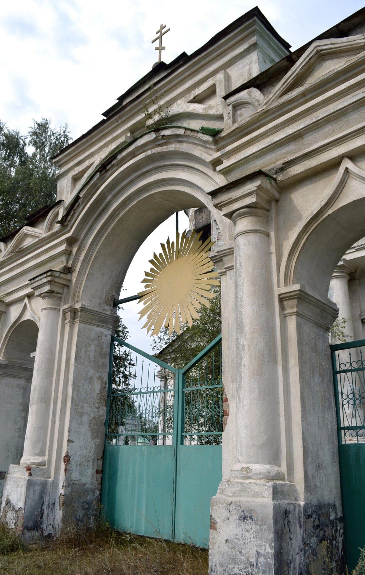 Величественные каменные ворота, увенчанные православным крестом, служат торжественным входом на территорию храмового комплекса. Их архитектура отличается монументальностью и благородной простотой. Центральную арку украшает массивный кованый декоративный элемент в виде сияющего солнца — символ Христа, Света миру. Двустворчатые полотна ворот, окрашенные в умиротворяющий бирюзовый цвет, украшены мощными коваными деталями, говорящими о высоком мастерстве кузнецов прошлого.