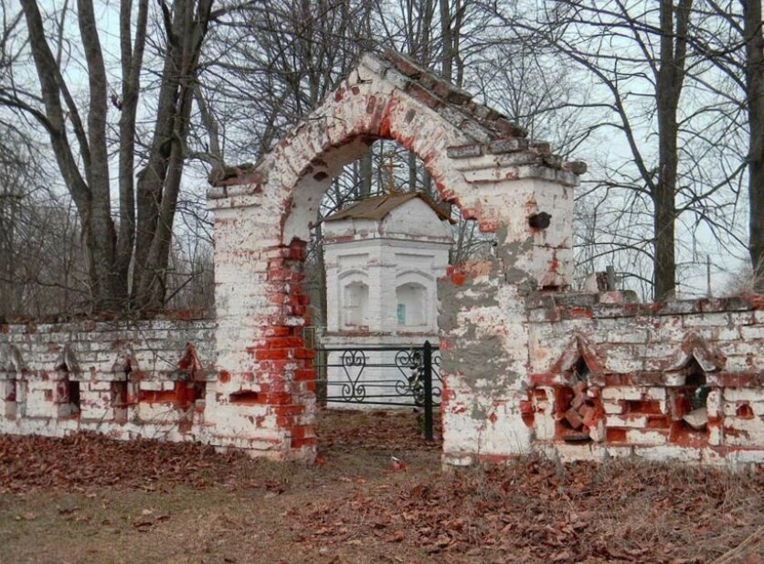 Через арочный проем открывается вид на внутреннюю территорию кладбища, где выделяется кованый металлический забор, ведущий к небольшой часовне. Часовня представляет собой скромное белое строение, увенчанное православным крестом на четырехскатной кровле. На фасаде часовни различимы две арочные ниши, которые в прошлом, вероятно, служили для размещения икон или фресок.