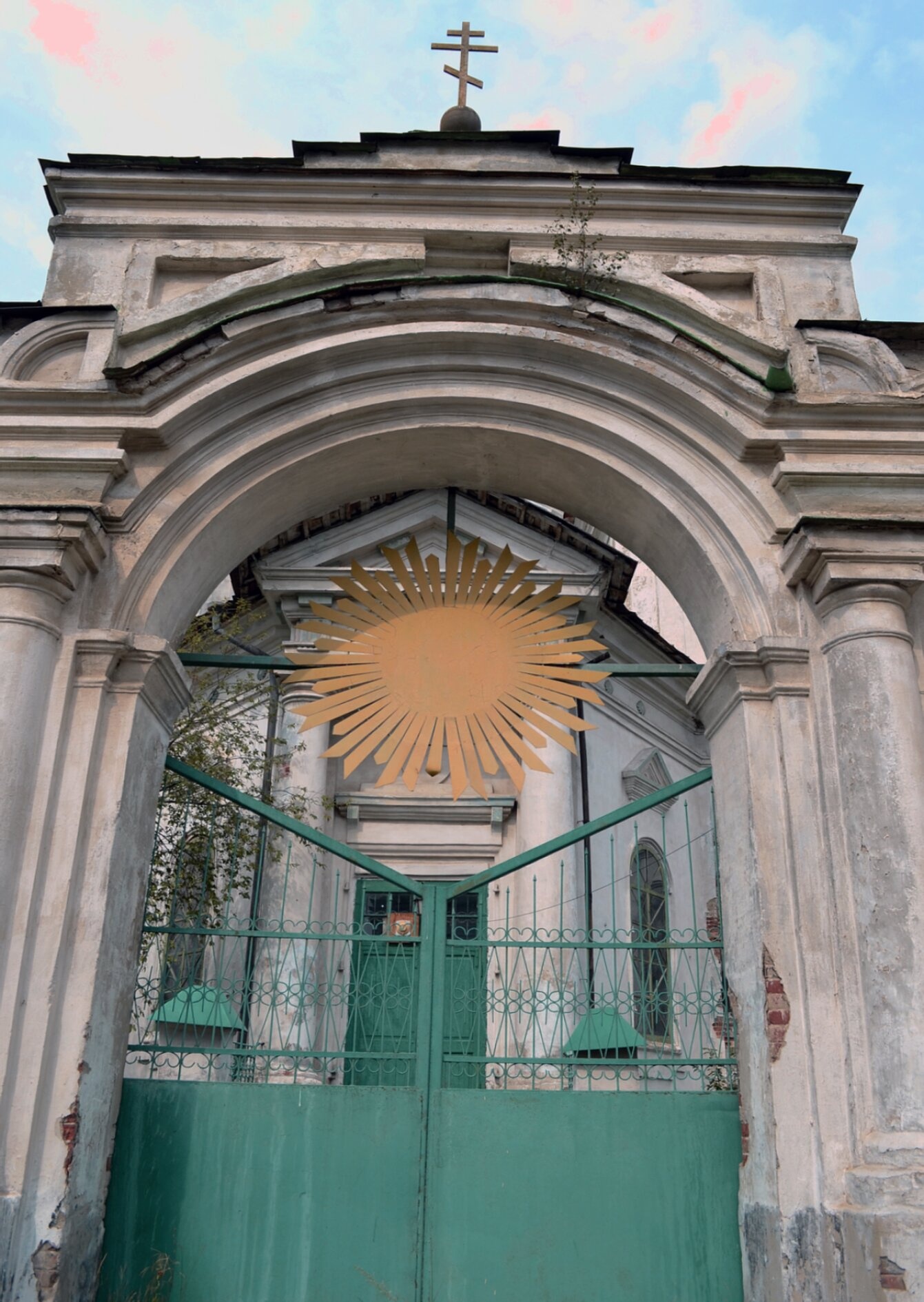 На представленной фотографии запечатлены южные входные ворота ограды старинного каменного храма во имя Святителя Николая Чудотворца, что в селе Быньги Свердловской области. Этот уникальный памятник церковной архитектуры был возведён в 1789 году на месте обветшавшей деревянной церкви и является одним из первых каменных храмов на Урале, построенных в стиле русского барокко.