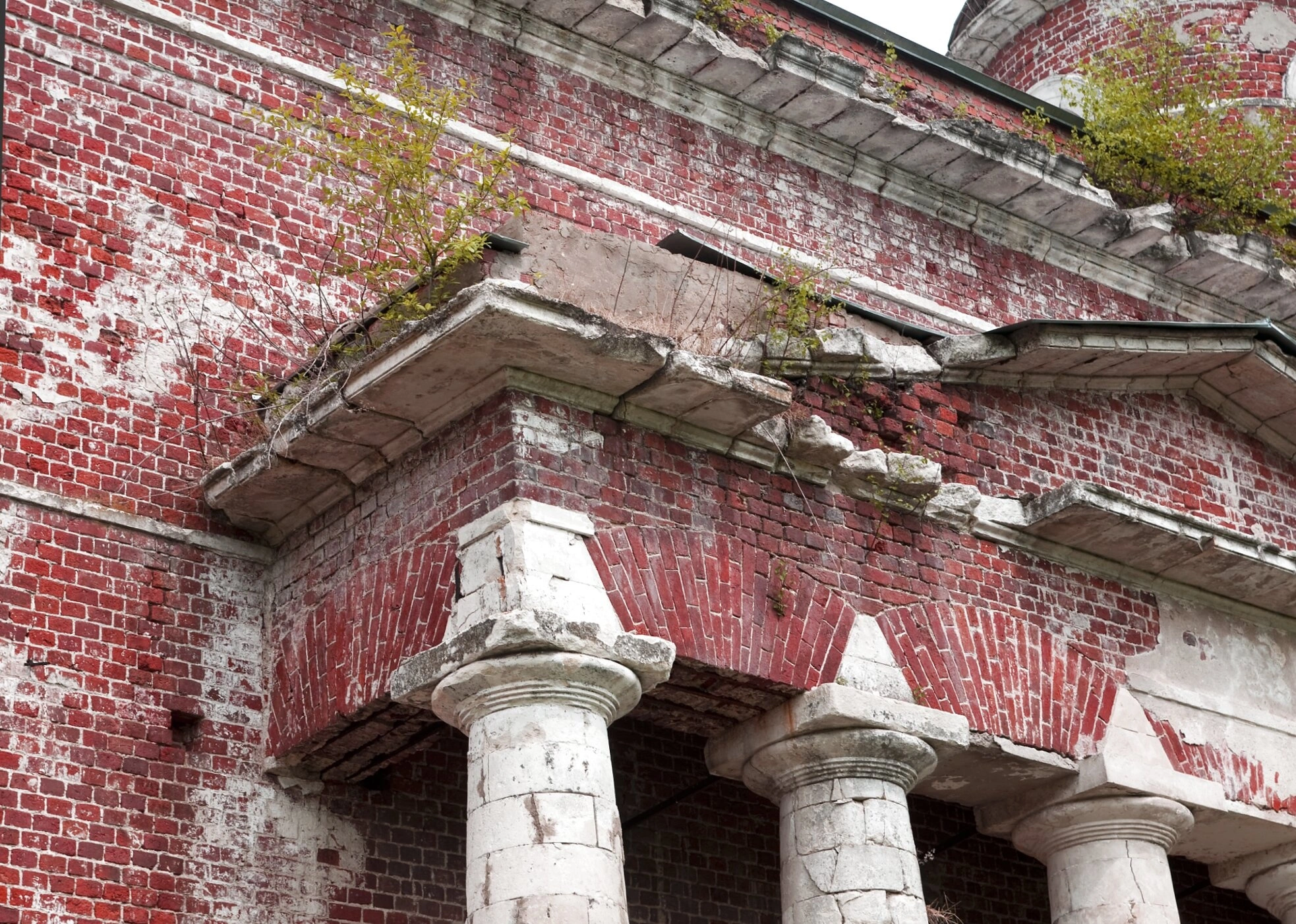 На представленной фотографии запечатлён фрагмент южного портика Церкви Успения Пресвятой Богородицы, что расположена в селе Подсосино Сергиево-Посадского района Московской области. Снимок детально показывает элементы храмовой архитектуры, выполненной из красного кирпича. Чётко видны массивные колонны, увенчанные капителями классической формы, которые поддерживают элементы антаблемента. Кирпичная кладка, демонстрирующая высокое мастерство зодчих, сохранила свою геометрию, несмотря на приметы времени.