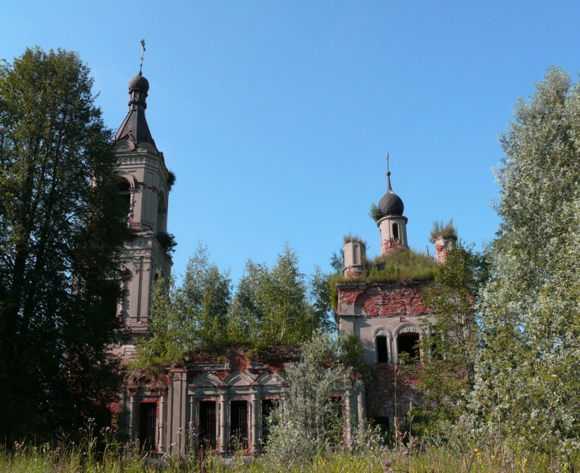 Храм окружает густая растительность: молодые деревья и кустарники плотно обступили здание, а высокая трава скрывает основание церкви. Несмотря на разруху, в архитектуре угадываются черты православного храмового зодчества, характерного для русской провинции. Ясное голубое небо, запечатлённое над церковью, создаёт контраст с печальным состоянием святого места.