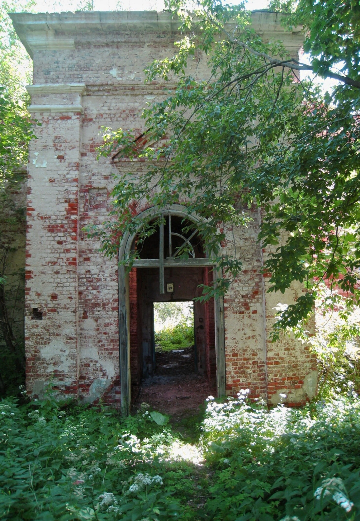На представленной фотографии запечатлен вход в заброшенный храм Преображения Господня, расположенный в деревне Борозда Клинского района Московской области. Святыня, некогда бывшая духовным центром для местных жителей, ныне пребывает в состоянии печального запустения.