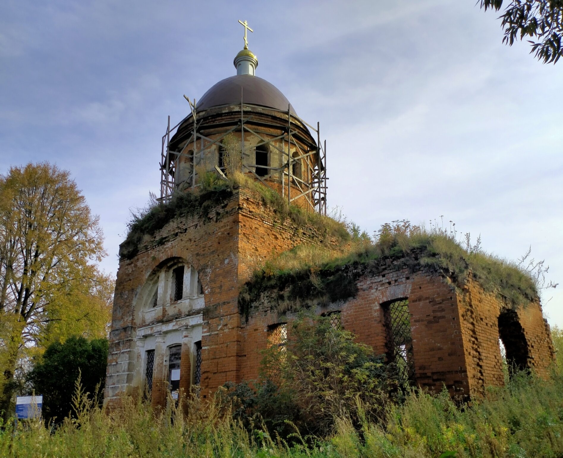 Примечательно, что вокруг купола видны деревянные строительные леса, что может указывать на начавшиеся работы по консервации или реставрации памятника архитектуры. Стены храма местами обвалились, кирпичная кладка обнажена и поросла травой и кустарником. Растительность покрывает не только стены, но и кровлю здания, подчеркивая длительное время его заброшенности.