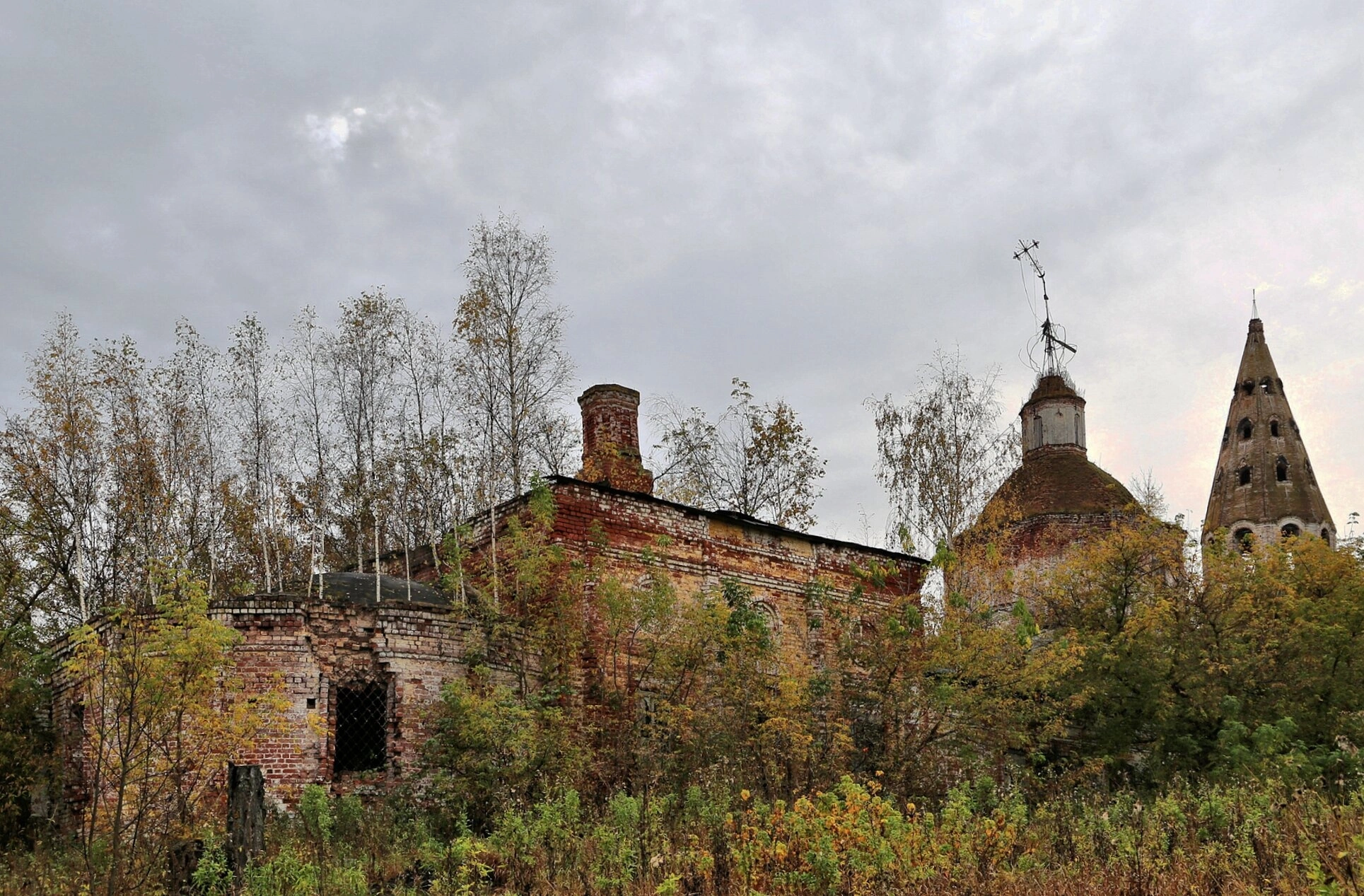 Особую атмосферу скорби создают оконные проемы, повсеместно заколоченные деревянными досками. Храм плотно окружен древесной растительностью, где осенняя листва окрашена в tones от зеленого до ярко-желтого. Густые кустарники перед зданием разрослись, частично скрывая нижний ярус постройки.