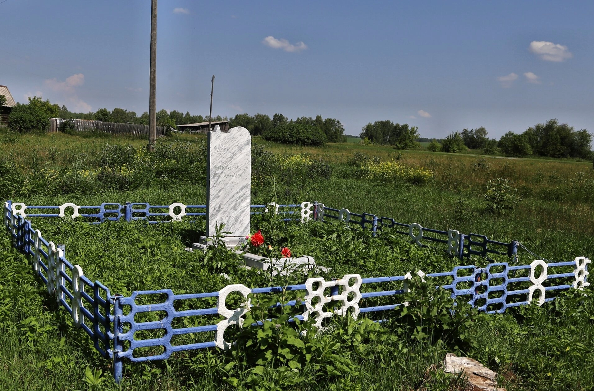 Окружающий пейзаж с зеленой травой и дикорастущей растительностью, а также виднеющийся слева столб линии электропередач создают пронзительный контраст между прошлым и настоящим этого уникального памятника православной культуры Зауралья.