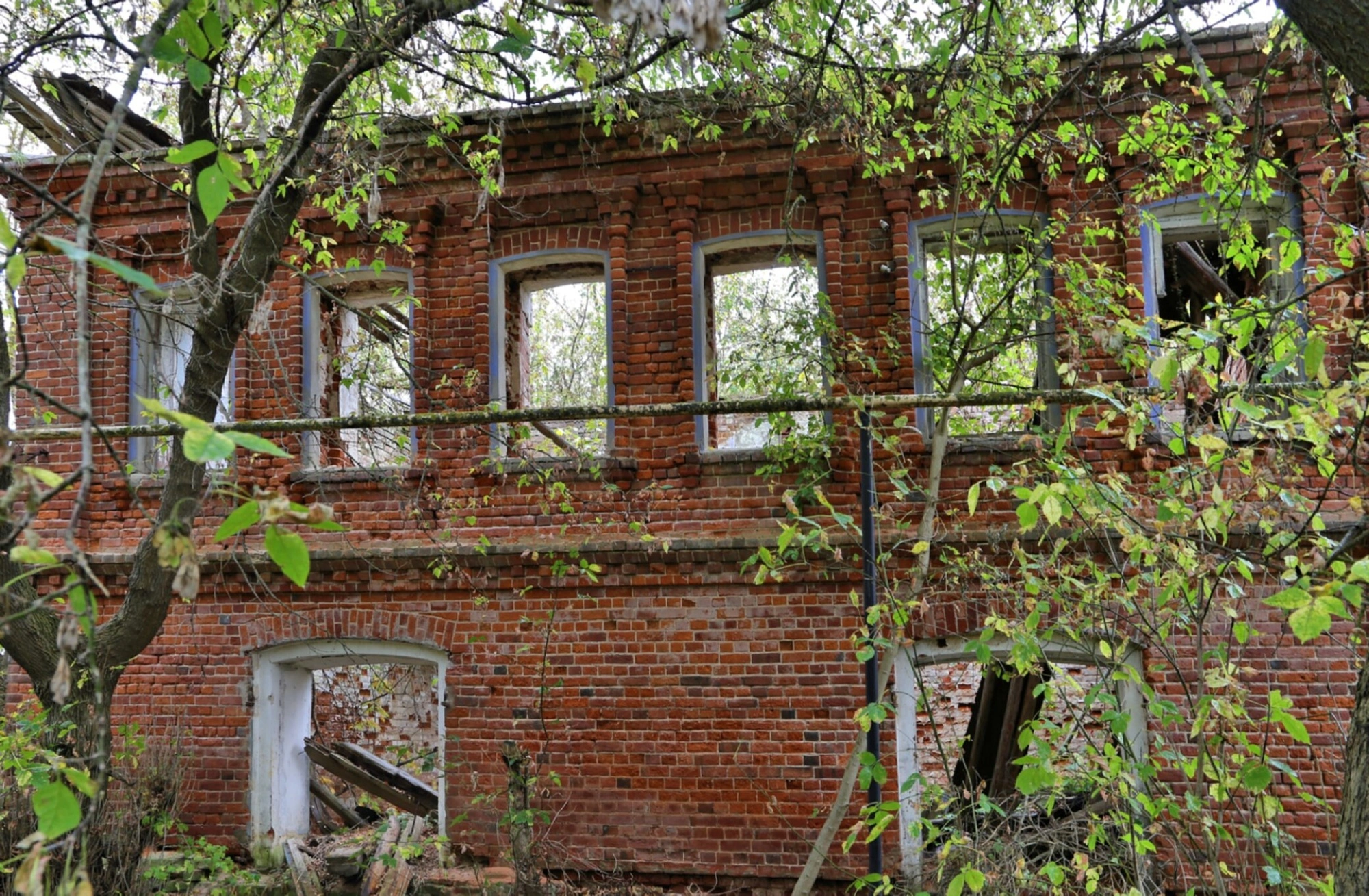 Крыша храма частично обрушена, что открывает небесному своду доступ во внутреннее пространство. Стены и оконные проёмы обильно заросли древесной растительностью и кустарником, которые своими корнями постепенно разрушают кирпичную кладку. Молодая листва окружающих деревьев частично скрывает фасад здания, создавая ощущение поглощения творения человеческих рук природной стихией.