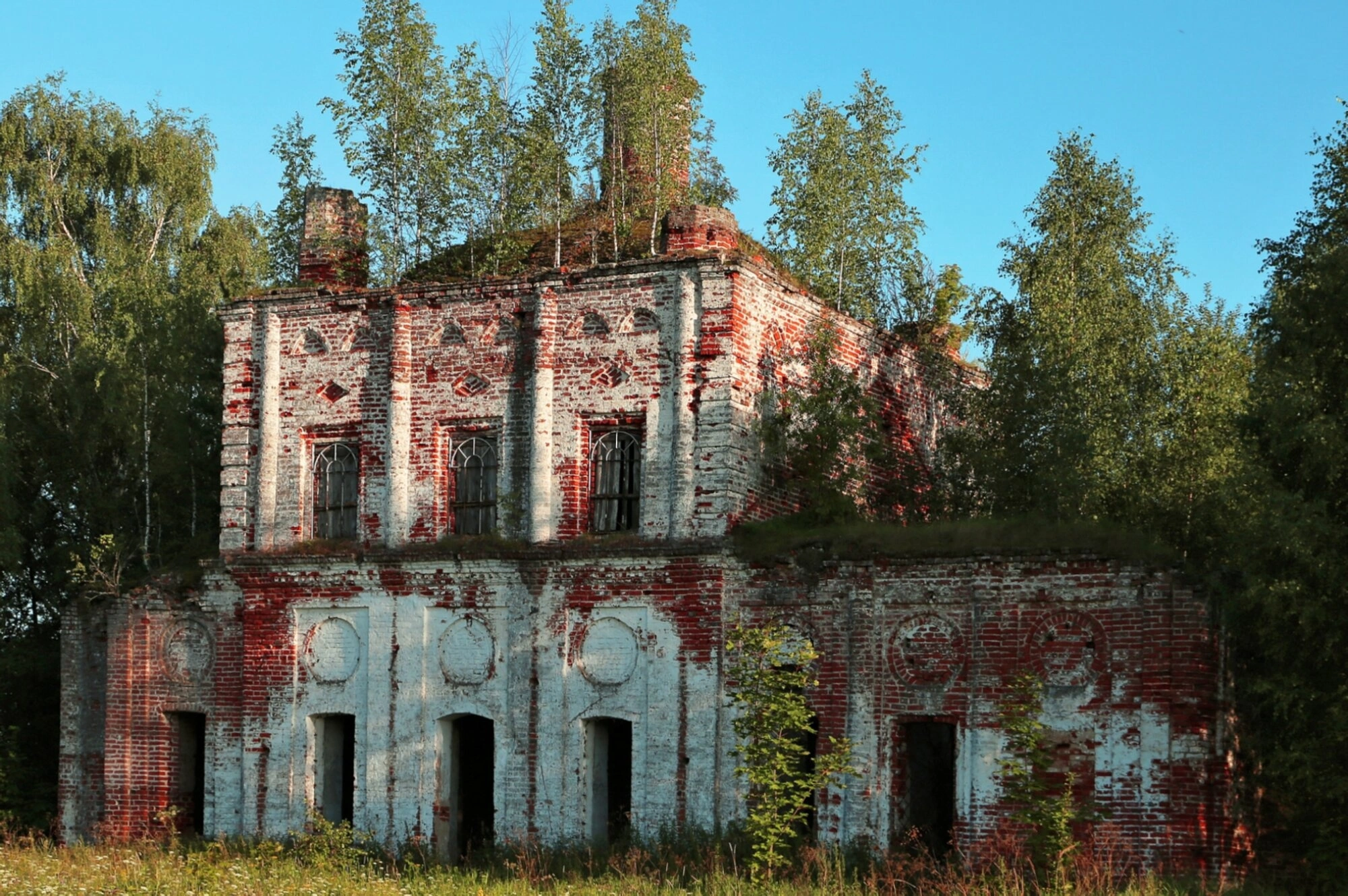 Храм обильно зарос дикой растительностью: деревья и кустарники проросли прямо сквозь стены и фундамент, создавая впечатление полного поглощения творения человеческих рук природной стихией. Несмотря на разруху, в архитектурных формах ещё угадываются черты православного храмового зодчества, напоминающие о былом духовном назначении этого места.