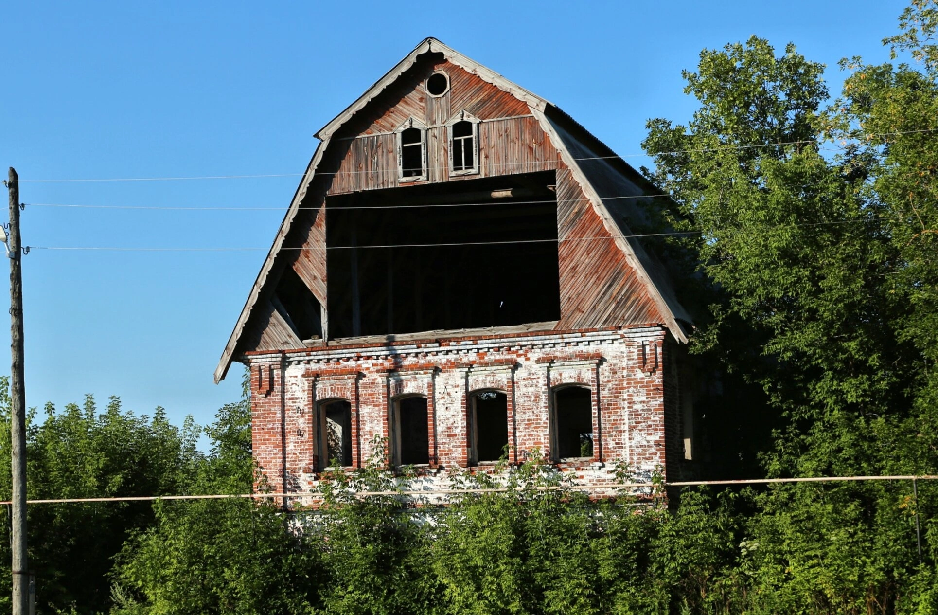 В архитектурном решении фасада просматриваются два небольших оконных проёма на втором этаже, а также обширное пустое пространство, где ранее располагались ворота. Храм окружён густыми зарослями деревьев и кустарников, что подчёркивает его заброшенное состояние. На заднем плане видно чистое голубое небо, а слева от здания установлен столб с электропроводами.