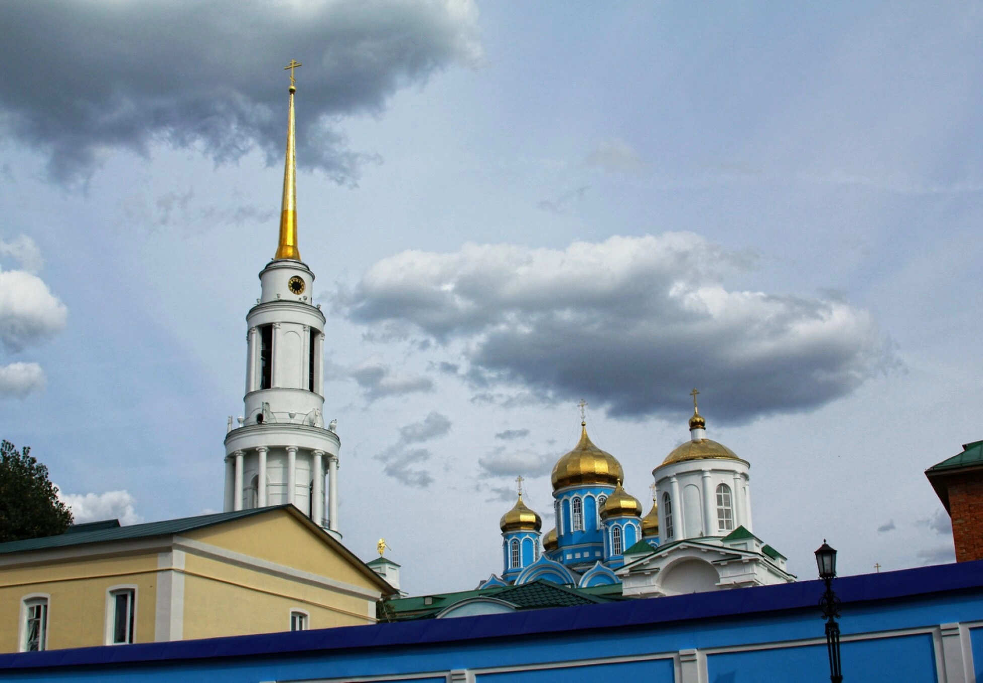 Небо на фотографии покрыто облаками, создавая атмосферу благочестивого спокойствия и умиротворения, характерную для православных святынь. Слева от колокольни виднеется зелень дерева, что добавляет кадру естественности и гармонии с божественным творением. Архитектурный ансамбль монастыря представляет собой прекрасный образец русского церковного зодчества, воплощающий в себе духовное величие и благодать.