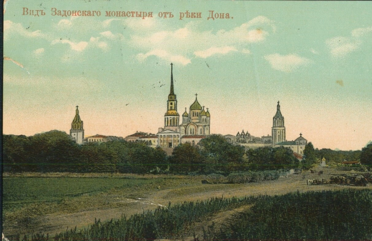 Надпись на старославянском языке «Видъ Задонскаго монастыря отъ рѣки Дона» точно передает содержание изображения. Этот вид на монастырский комплекс с реки Дон исторически является одним из самых узнаваемых и духовно значимых образов Задонской обители, привлекающей многочисленных паломников со всей России.
