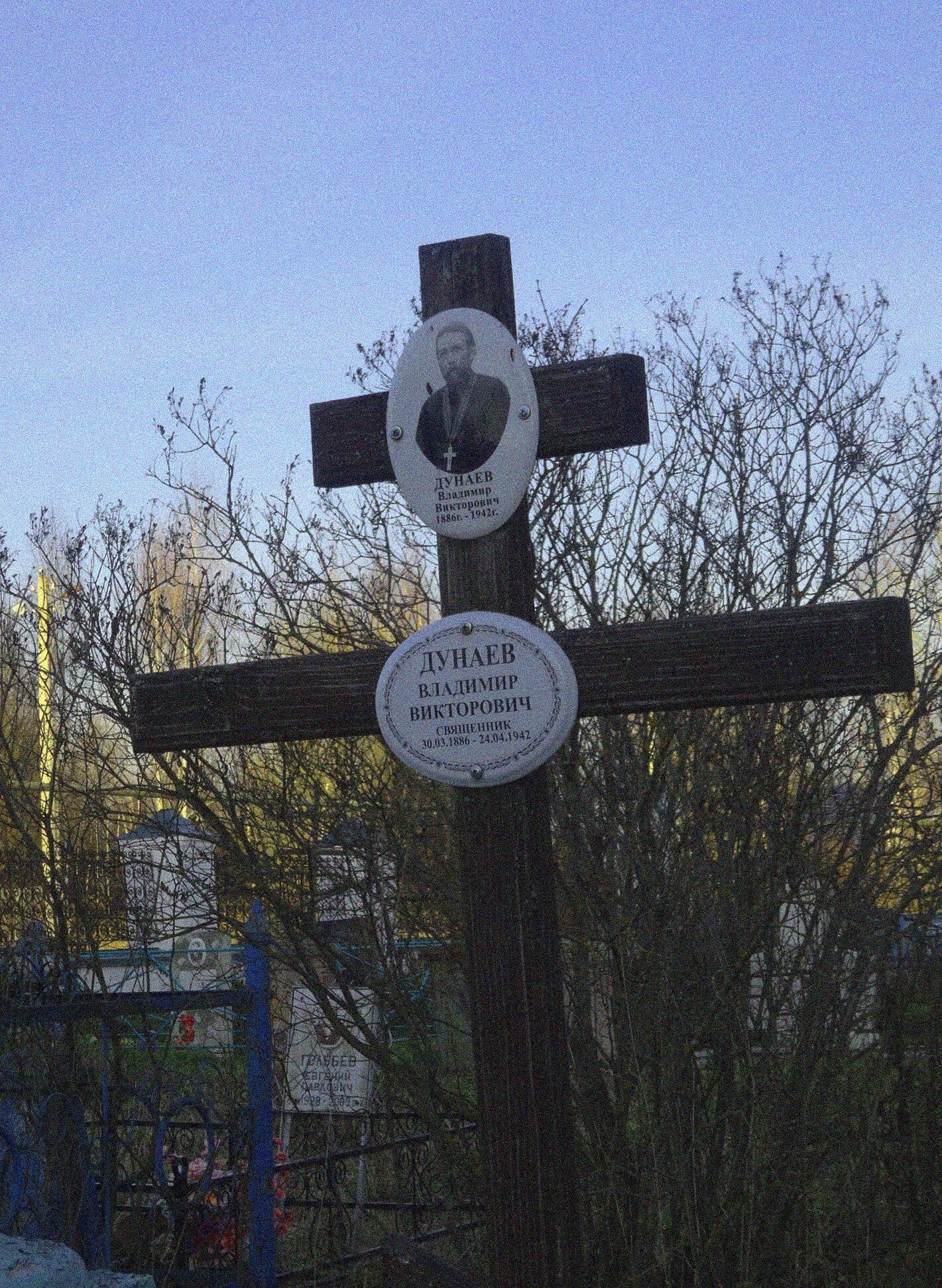 На фотографии запечатлён участок старинного православного кладбища, расположенного вблизи храма Святой Троицы в селе Каменово Владимирской области. В центре кадра находится могила почившего служителя Церкви — протоиерея Владимира Викторовича Дунаева. Над местом его упокоения воздвигнут деревянный крест, увенчанный овальной табличкой с памятной надписью: «ДУНАЕВ ВЛАДИМИР ВИКТОРОВИЧ СВЯЩЕННИК 30.03.1886-14.04.1942».