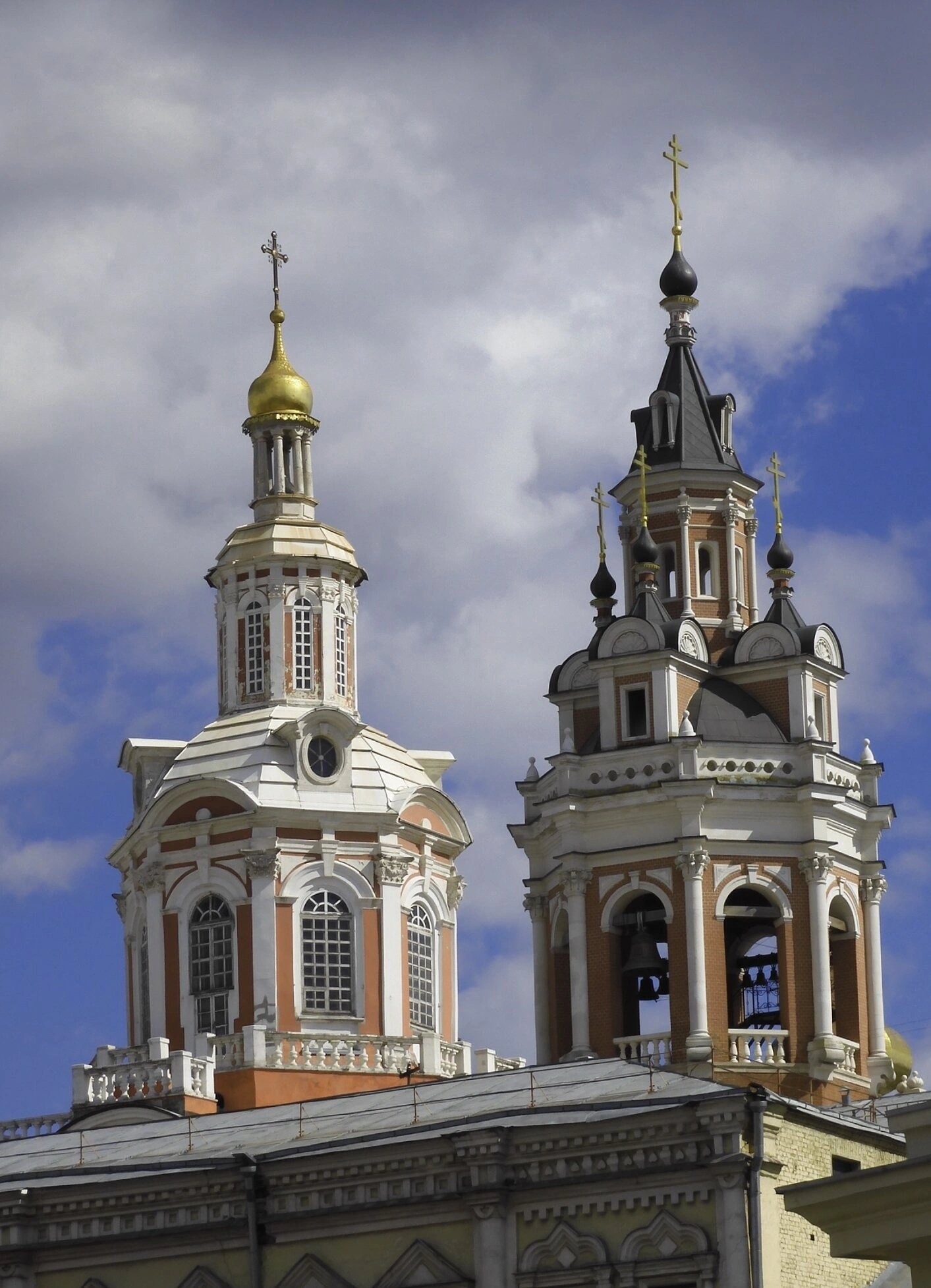 Главной архитектурной доминантой обители и центральным объектом на снимке выступает величественный собор Спаса Нерукотворного Образа, увенчанный златоглавыми куполами, которые сияют под небосводом. Монументальный храм, возведённый в стиле русского барокко в начале XVIII столетия, представляет собой великолепный пример церковного зодчества. Его стройная колокольня, устремлённая ввысь, гармонично дополняет соборный комплекс и создаёт неповторимый силуэт монастыря в панораме Китай-города.