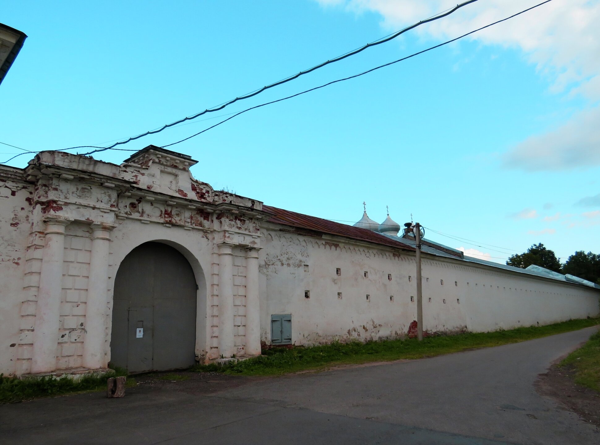 На представленной фотографии запечатлены западные ворота и фрагмент монастырской стены Свято-Юрьева мужского монастыря, одной из древнейших и наиболее почитаемых православных обителей России, основанной в 1030 году святым благоверным князем Ярославом Мудрым во имя своего небесного покровителя — великомученика Георгия Победоносца.