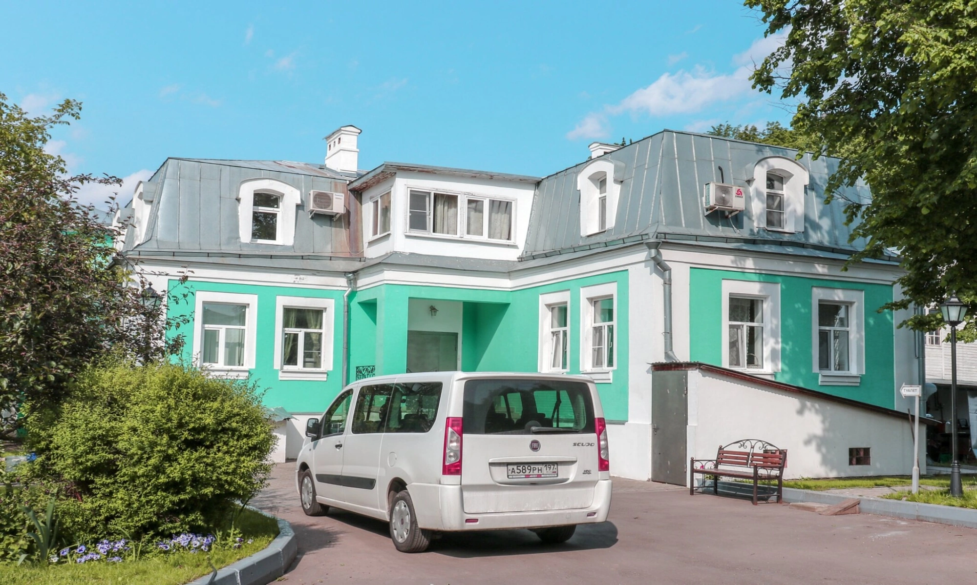 На представленной фотографии запечатлено здание церковно-приходской школы при храме Архангела Михаила в селе Летово. Это двухэтажное строение, окрашенное в яркий бирюзовый цвет с белыми декоративными элементами, под серой металлической крышей. Архитектура здания включает мансардные окна и различные пристройки, что характерно для построек начала XXI века.