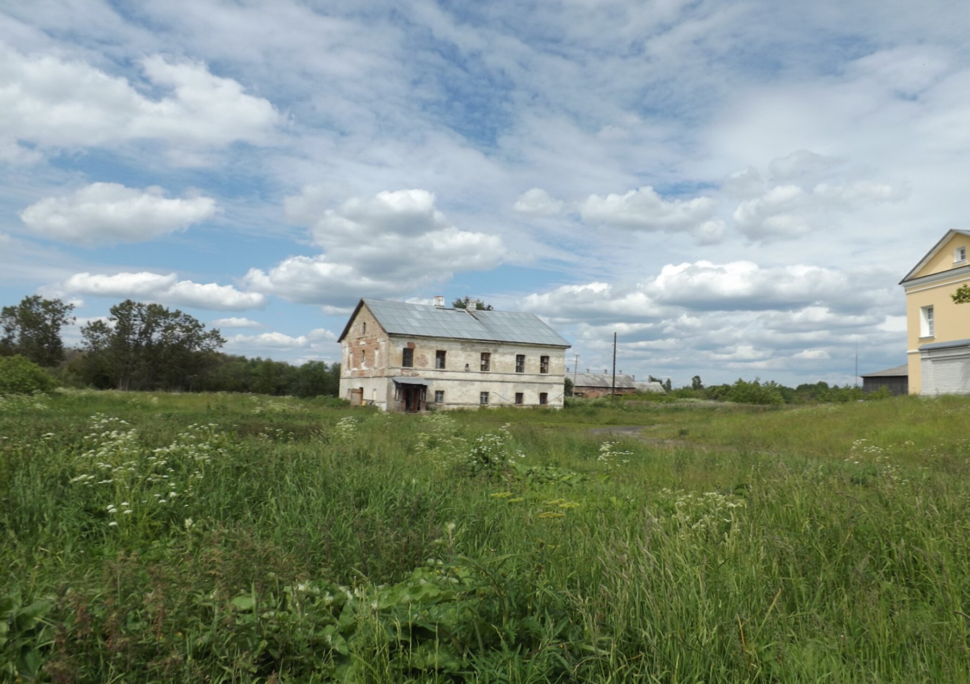 На представленной фотографии запечатлено одно из строений Введено-Оятского женского монастыря, расположенного в Лодейнопольском районе Ленинградской области. С высокой долей вероятности на снимке изображено здание паломнической гостиницы или одного из хозяйственных корпусов святой обители, окружённое полем и сельским пейзажем.
