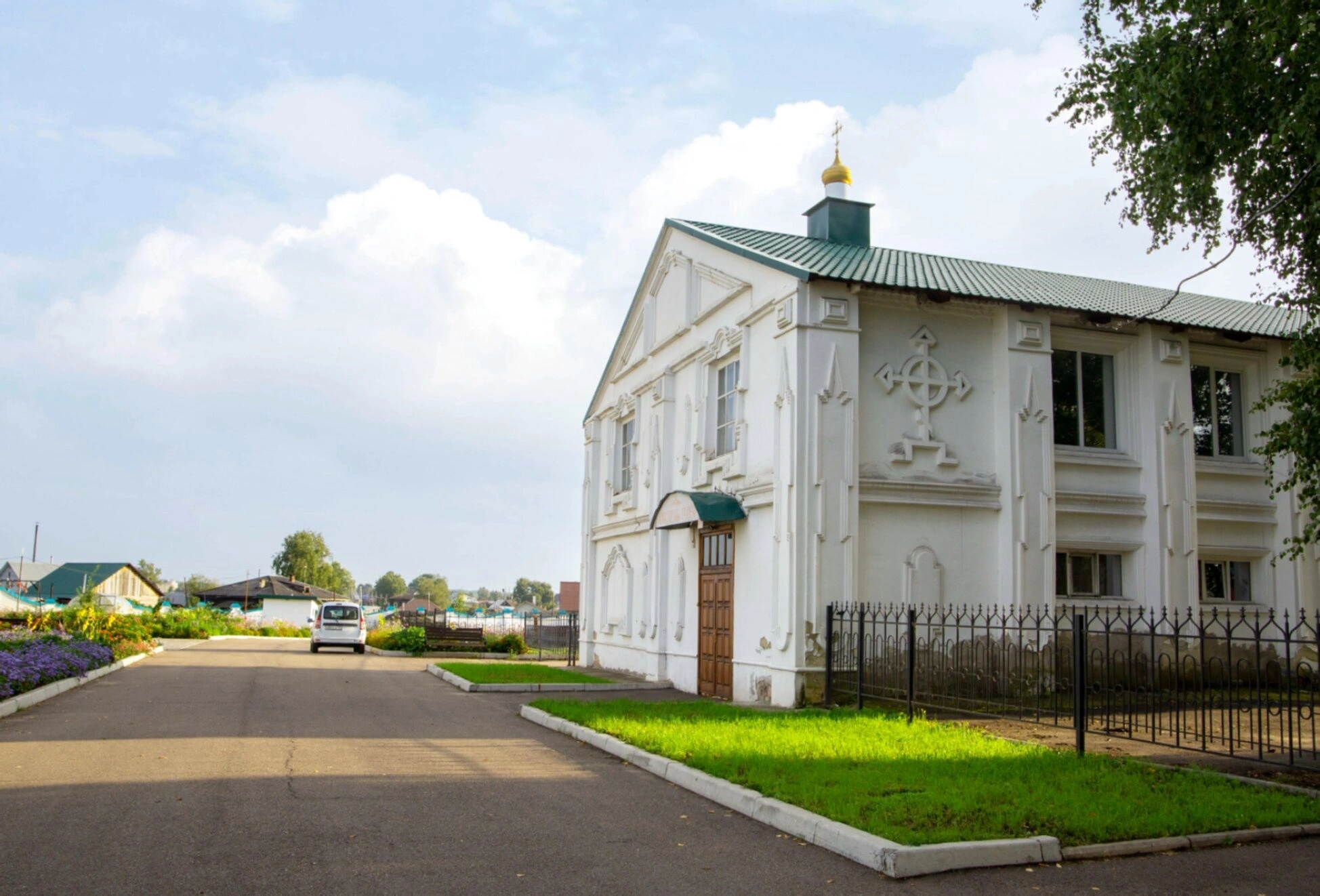 На фотографии запечатлён келейный корпус Спасо-Преображенского мужского монастыря, расположенного в городе Енисейске Красноярского края. Это белоснежное двухэтажное здание, увенчанное зелёной кровлей и сияющим золотым куполом с водружённым на него православным крестом, что указывает на его духовное назначение. Архитектурный облик строения отличается строгостью и благолепием, характерными для церковного зодчества. Фасад украшен декоративными элементами, подчёркивающими его особый статус. Территория вокруг благоустроена: вдоль асфальтированной дороги разбит ухоженный газон и цветочные клумбы. Ограждение из чёрных металлических прутьев обозначает границы святой обители.