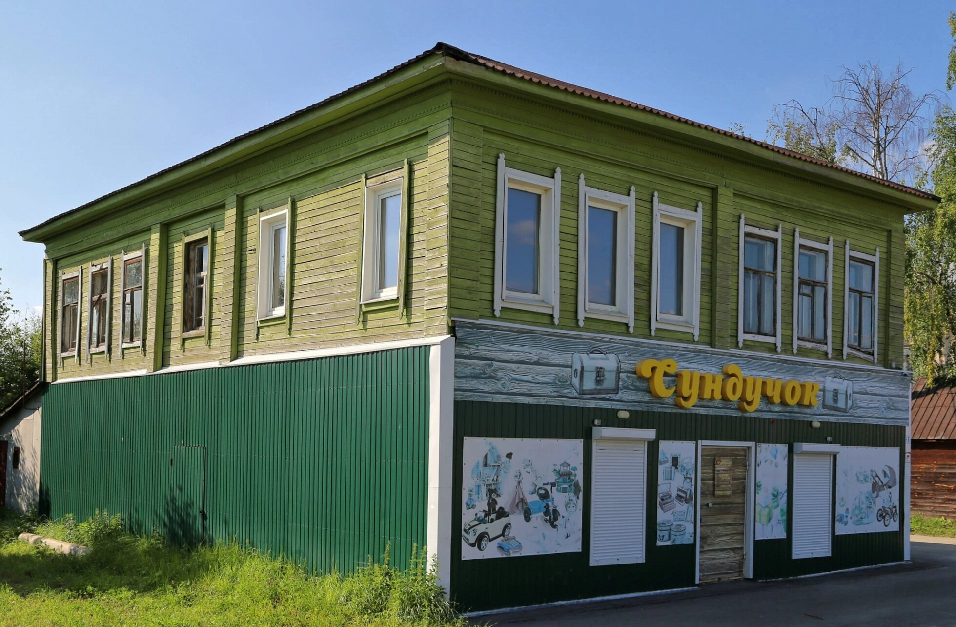 На представленном фотографическом изображении запечатлено двухэтажное здание, в котором располагается магазин под названием «Сундучок». Архитектурное решение сооружения демонстрирует характерные для провинциальной застройки особенности. Верхний этаж выполнен из деревянного бруса, окрашенного в спокойный зелёный цвет, что придаёт строению определённую долю уюта и традиционности.