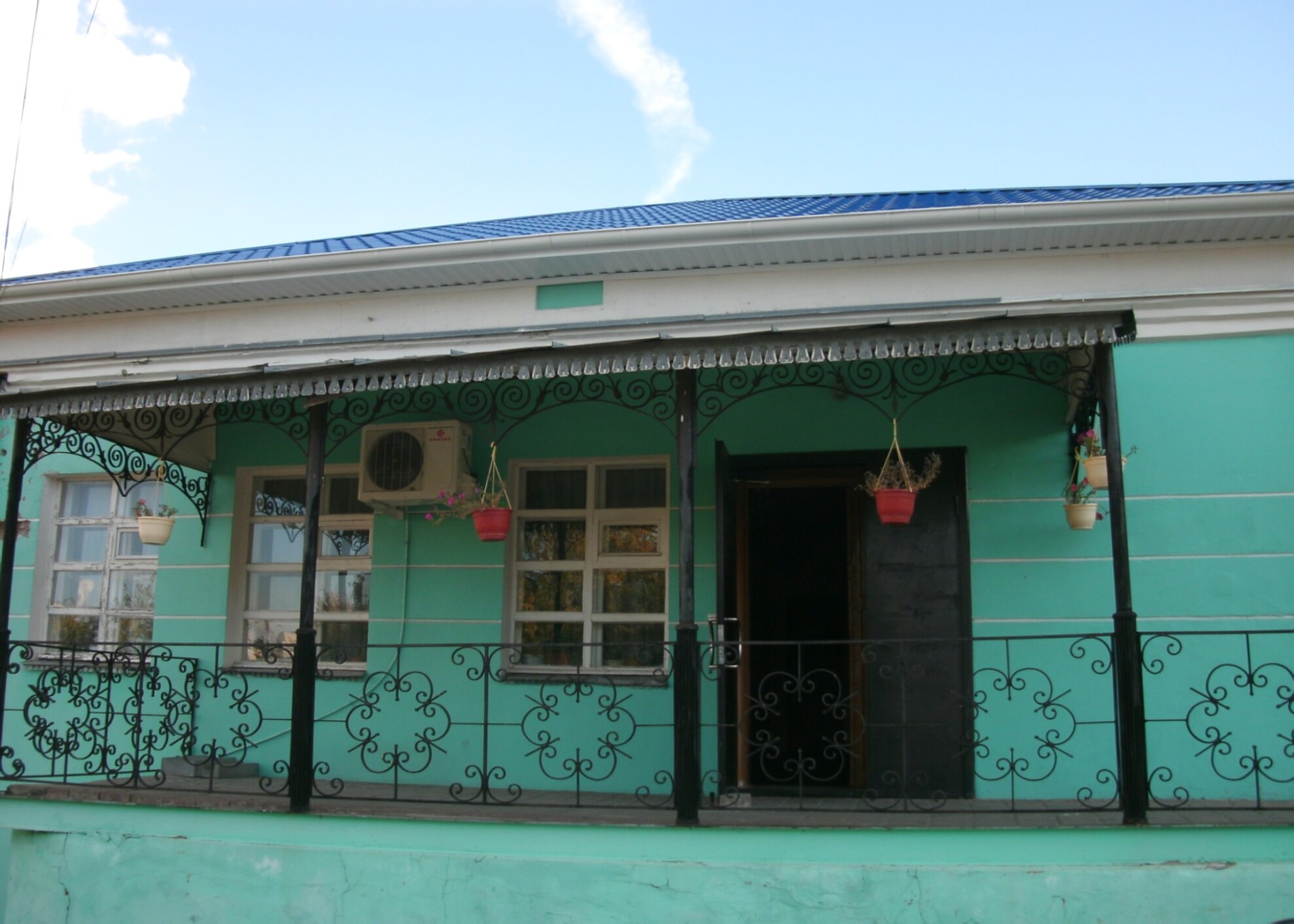 Фасад здания украшает просторная веранда с ажурными коваными перилами, под сенью которой установлен кондиционер. На веранде размещены подвесные цветочные горшки, что придаёт месту особый уют и гостеприимство, символизируя духовное процветание. Тёмная входная дверь и светлые многосекционные оконные рамы завершают облик этого добротного строения.