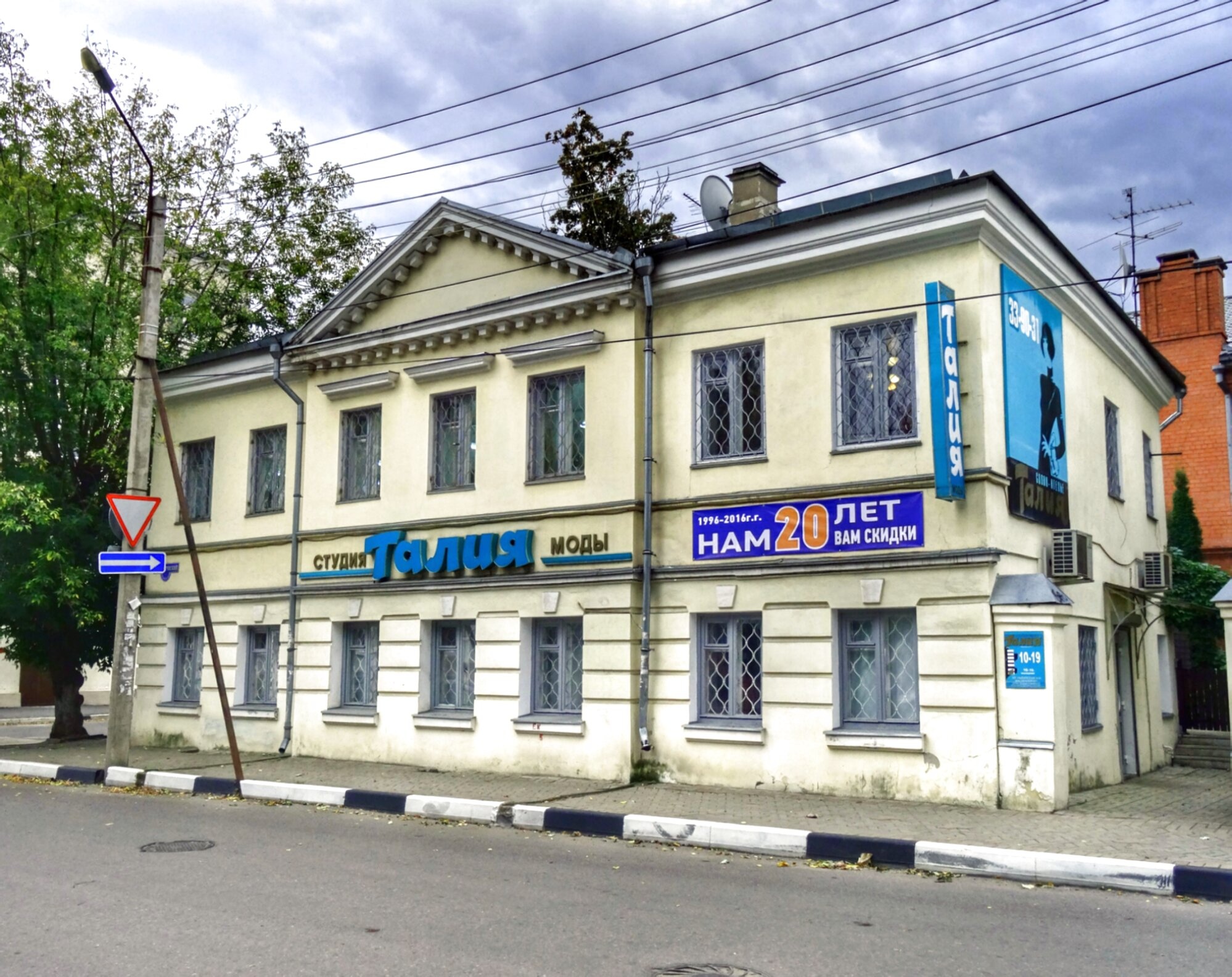 На представленной фотографии запечатлено двухэтажное здание светло-желтого цвета, расположенное в Студенческом переулке города Тверь. Согласно географическим координатам, строение находится в исторической части города. Фасад здания украшают две информационные вывески: на одной указано название располагающегося здесь ателье «Студия Талия моды», на другой отмечена юбилейная дата «1996-2016г.г. Нам 20 лет Вам скидки».