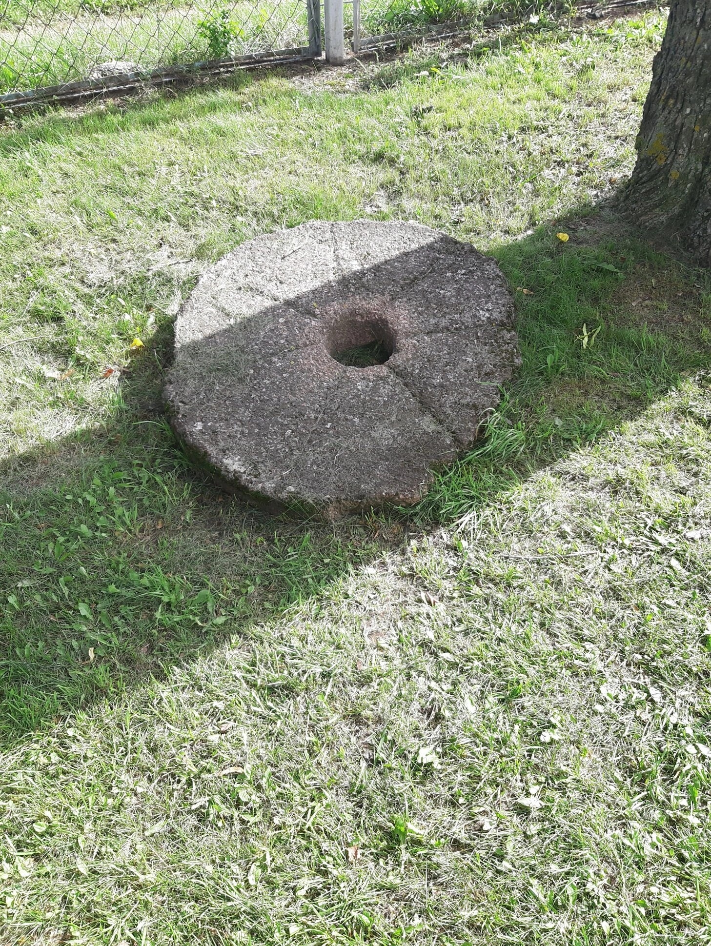 На представленной фотографии запечатлён древний жернов, находящийся на территории храма Рождества Пресвятой Богородицы в агрогородке Мурованка Щучинского района Гродненской области. Этот каменный круг с отверстием в центре, некогда использовавшийся для помола зерна на мельнице, ныне пребывает в покое под сенью деревьев, являясь немым свидетелем истории этого святого места.