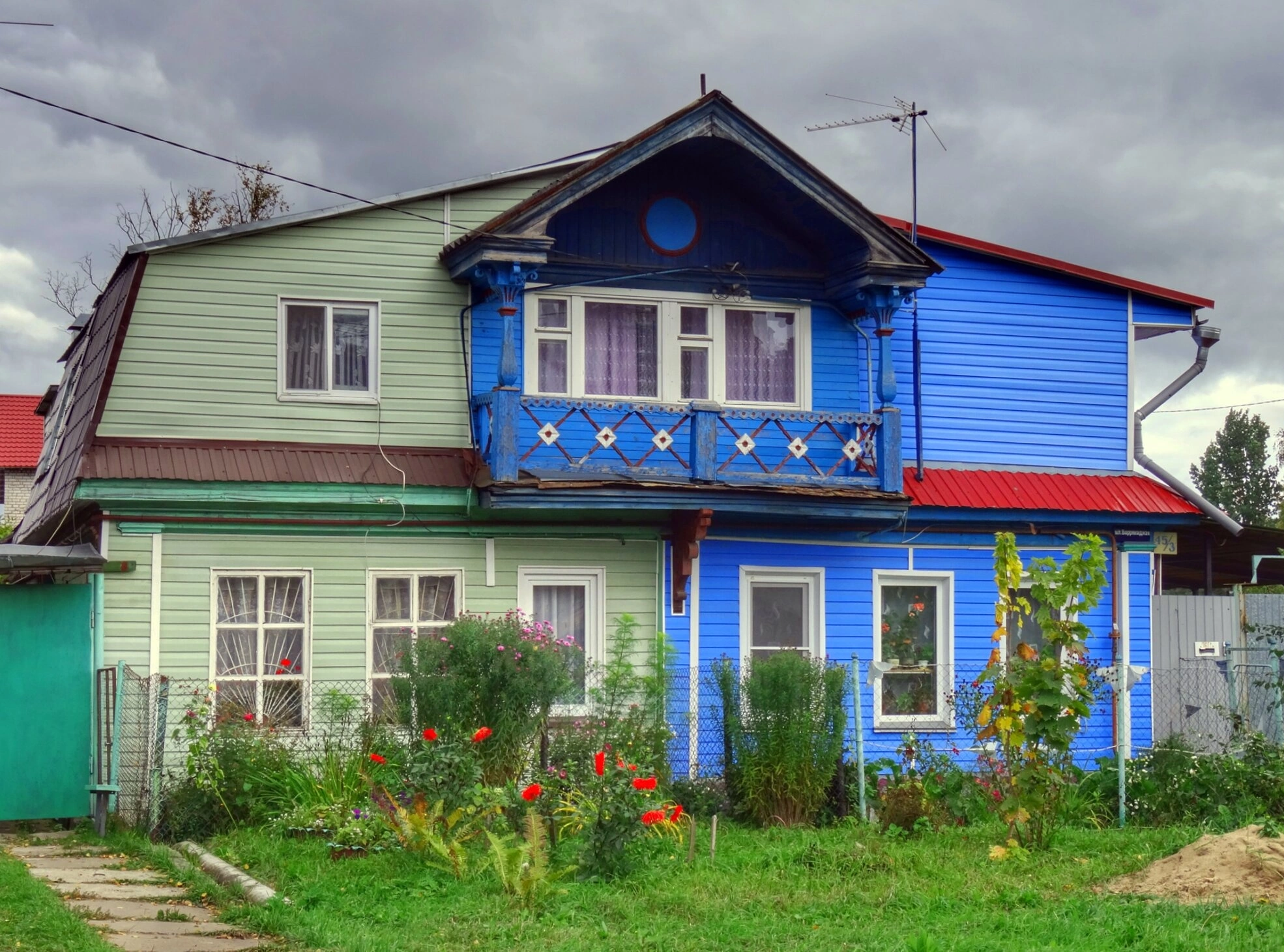На представленном фотографическом изображении запечатлен двухэтажный жилой дом, расположенный в городе Твери. Архитектурное сооружение состоит из нескольких секций, облицованных сайдингом различных цветовых решений. Левая часть здания обшита светло-зеленым материалом и увенчана коричневой кровлей. Центральный фасад выделяется синим цветом отделки и украшен балконом с искусно выполненным деревянным ограждением, демонстрирующим традиции русского зодчества. Правая секция сооружения также выполнена в синей цветовой гамме с красным кровельным покрытием.