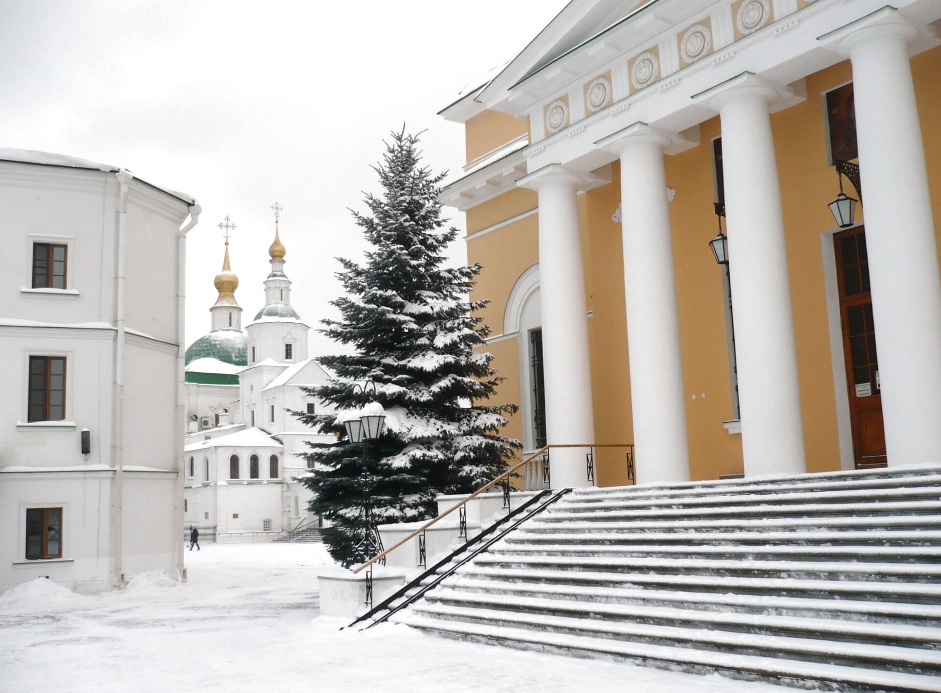 Свято-Троицкий собор, являющийся смысловым и архитектурным центром обители, предстаёт в своём умиротворённом зимнем убранстве. Пушистый снег покрывает его кровлю и венчает кресты, отчего весь образ наполняется тихой, благоговейной торжественностью, свойственной русской зиме. Монастырские строения, пережившие века и лихолетья, под снежным покровом обретают особую благодатную чистоту и монументальность.