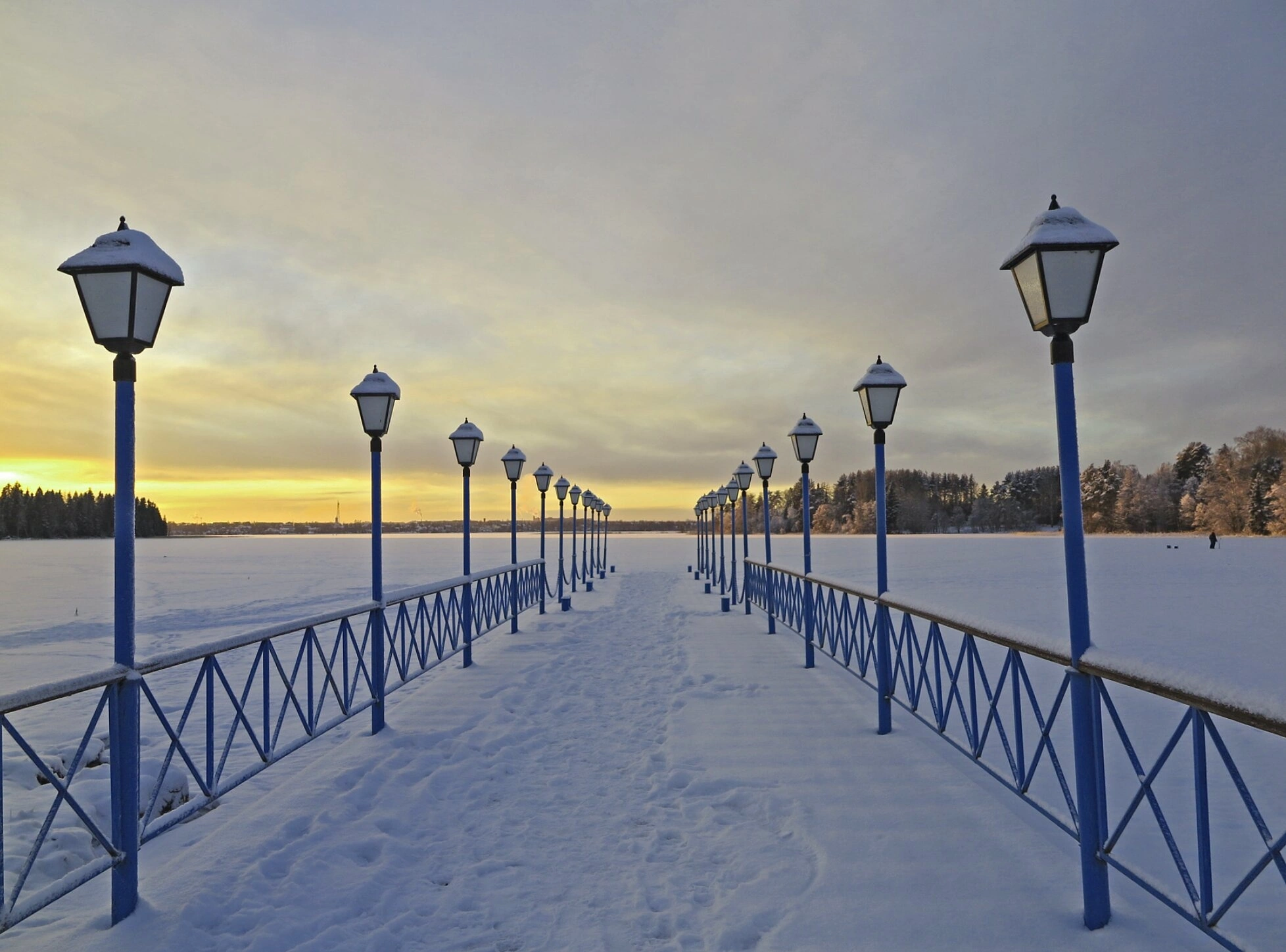 На фотографии запечатлён заснеженный деревянный причал Валдайского Иверского Богородицкого Святоозерского мужского монастыря, уходящий в гладь замёрзшего озера Валдай. Святая обитель, основанная Патриархом Никоном в 1653 году, издревле имела свою гавань для прибывающих по воде богомольцев. Этот пирс, обрамлённый рядами фонарных столбов, создающих благоговейную перспективу, служил вратами для тысяч православных христиан, стремившихся поклониться чудотворной Иверской иконе Божией Матери.