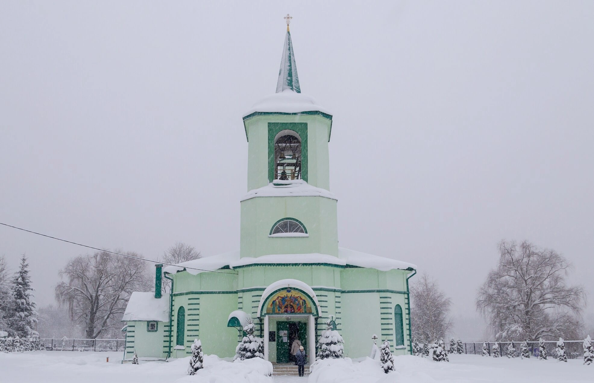 Фасад здания украшают строгие вертикальные пилястры и арочные элементы, придающие ему устремлённость ввысь. Над главным входом обращает на себя внимание декоративный элемент, возможно, выполненный в технике мозаики или храмовой росписи. В верхнем ярусе колокольни расположено полукруглое окно, пропускающее скудный зимний свет. Всё сооружение окружено глубоким, нетронутым снегом, который подчёркивает тишину и покой, царящие вокруг. Заснеженные вековые деревья и кустарники, а также фрагмент деревянного ограждения дополняют картину.