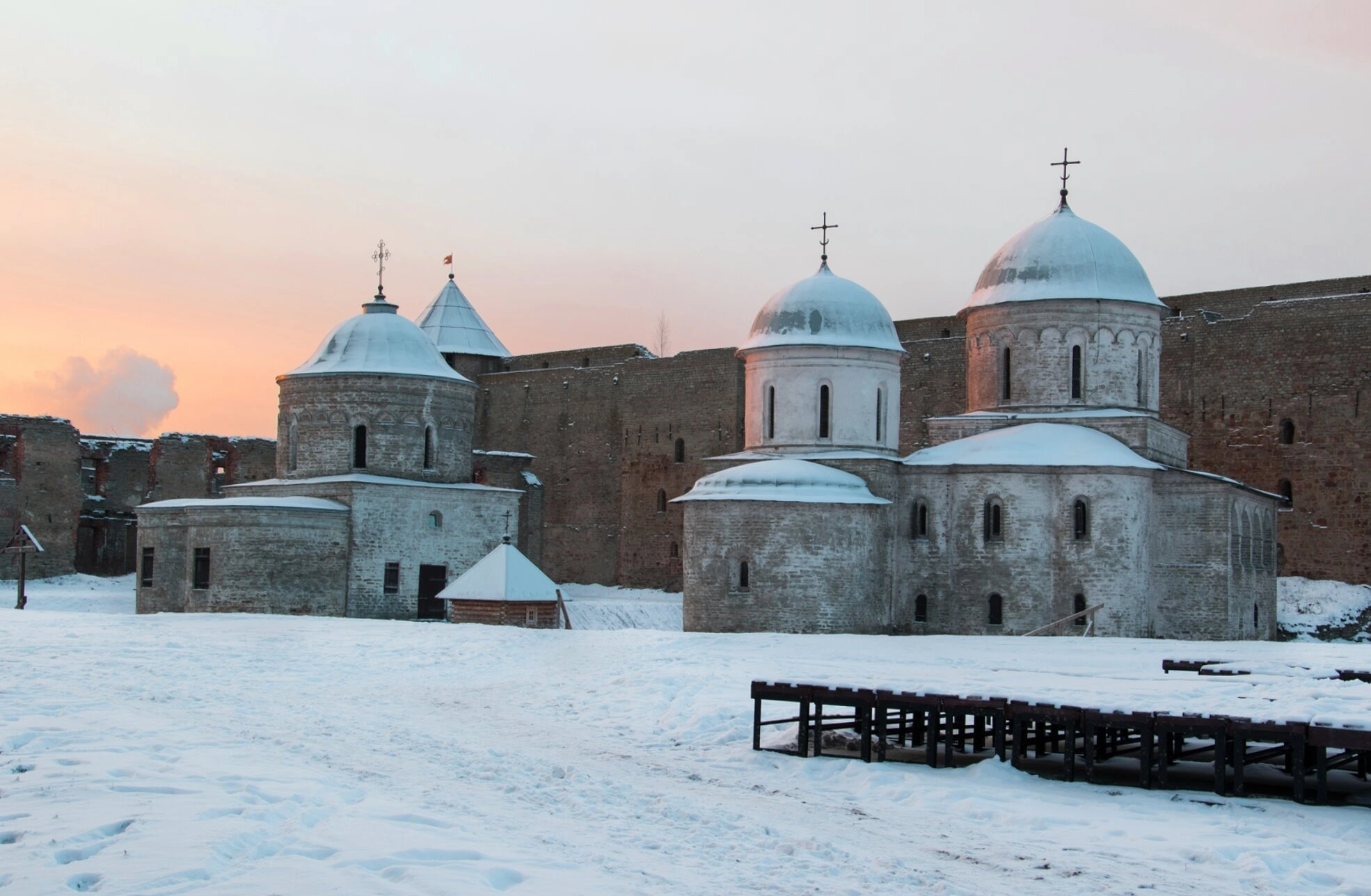 Зимний пейзаж придаёт архитектурному ансамблю особую торжественность и монументальность, напоминая о вечности и незыблемости духовных основ. Фотография передаёт не только историческую и архитектурную ценность места, но и его глубокий сакральный смысл как оплота Православия на приграничных землях.