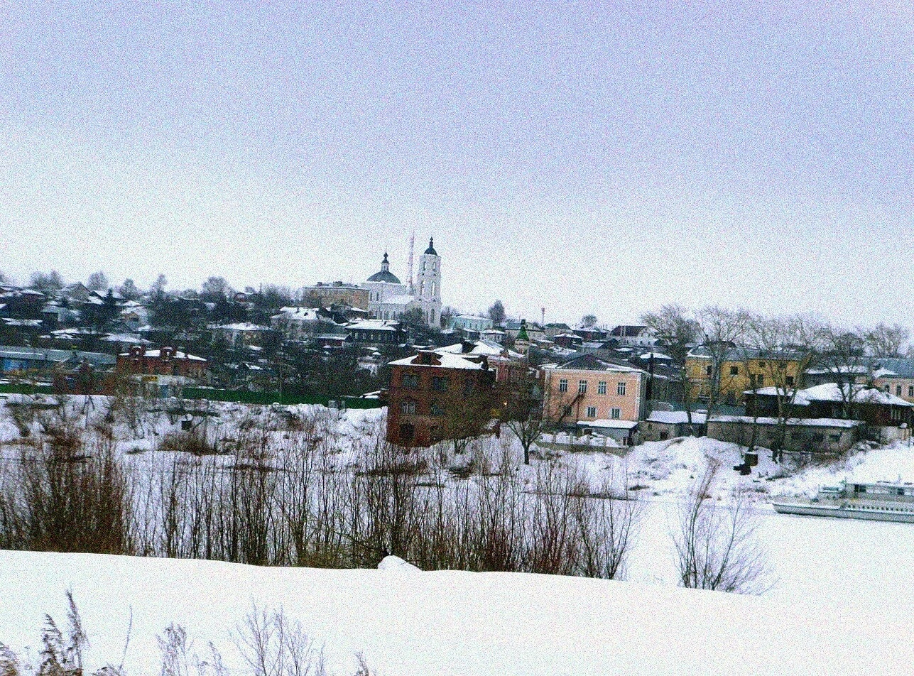 На возвышенности, на противоположном берегу, раскинулся сам город. Его особенностью является то, что историческая застройка органично сочетается с современными кварталами. Архитектурной и духовной доминантой панорамы, сердцем города выступает Собор Вознесения Христова — величественный пятиглавый храм с высокой колокольней, построенный в XIX веке. Его светлые стены и сияющие на пасмурном небе золочёные купола являются точкой притяжения взора, символизируя устремлённость человеческой души к горнему миру.